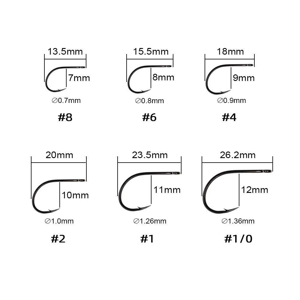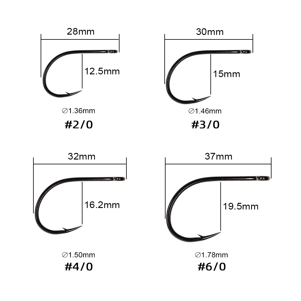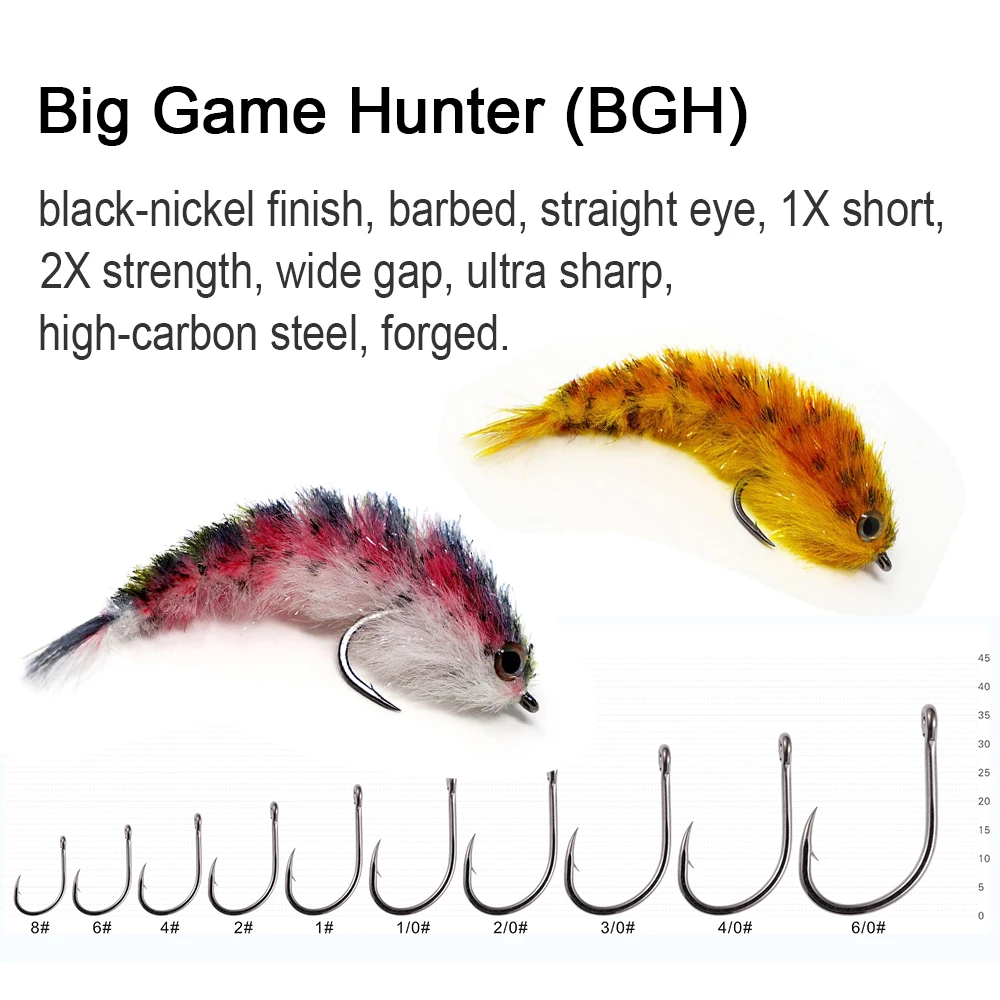 Especificaciones: mosca de juego grande de vástago corto, cambiador de juego, remolque y ganchos para tubos; Acabado en níquel negro, ojo recto, 1X corto, 2X de resistencia, amplio espacio, ultra afilado, acero con alto contenido de carbono, forjado.