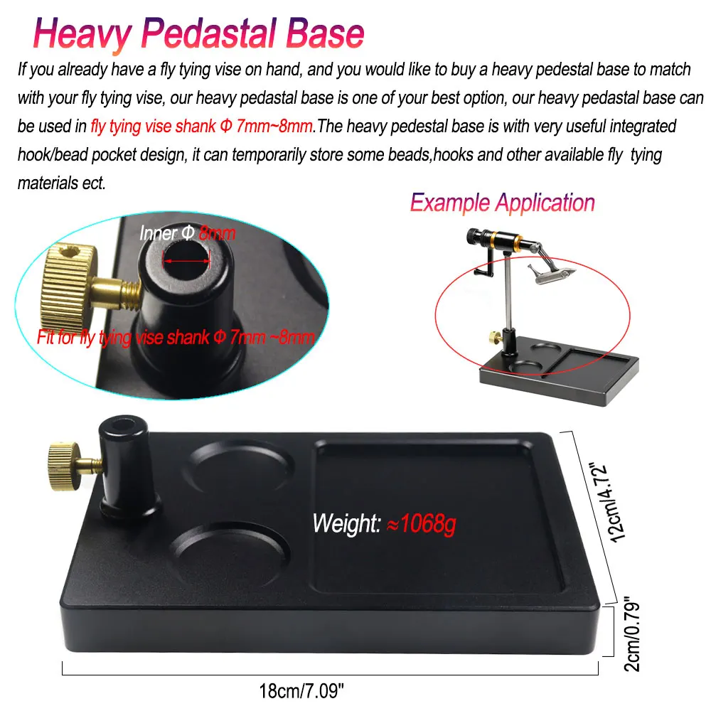 Si ya tiene un tornillo de banco para atar moscas a mano y desea comprar una base de pedestal pesado que combine con su tornillo de banco para atar moscas, nuestra base costera pesada es una de sus mejores opciones, nuestra base costera pesada se puede usar para atar moscas. Vástago de tornillo de banco Φ 7 mm ~ 8 mm.La base del pedestal pesado tiene un diseño de bolsillo integrado muy útil con gancho/cuentas, puede almacenar temporalmente algunas cuentas, ganchos y otros atados de moscas disponibles.