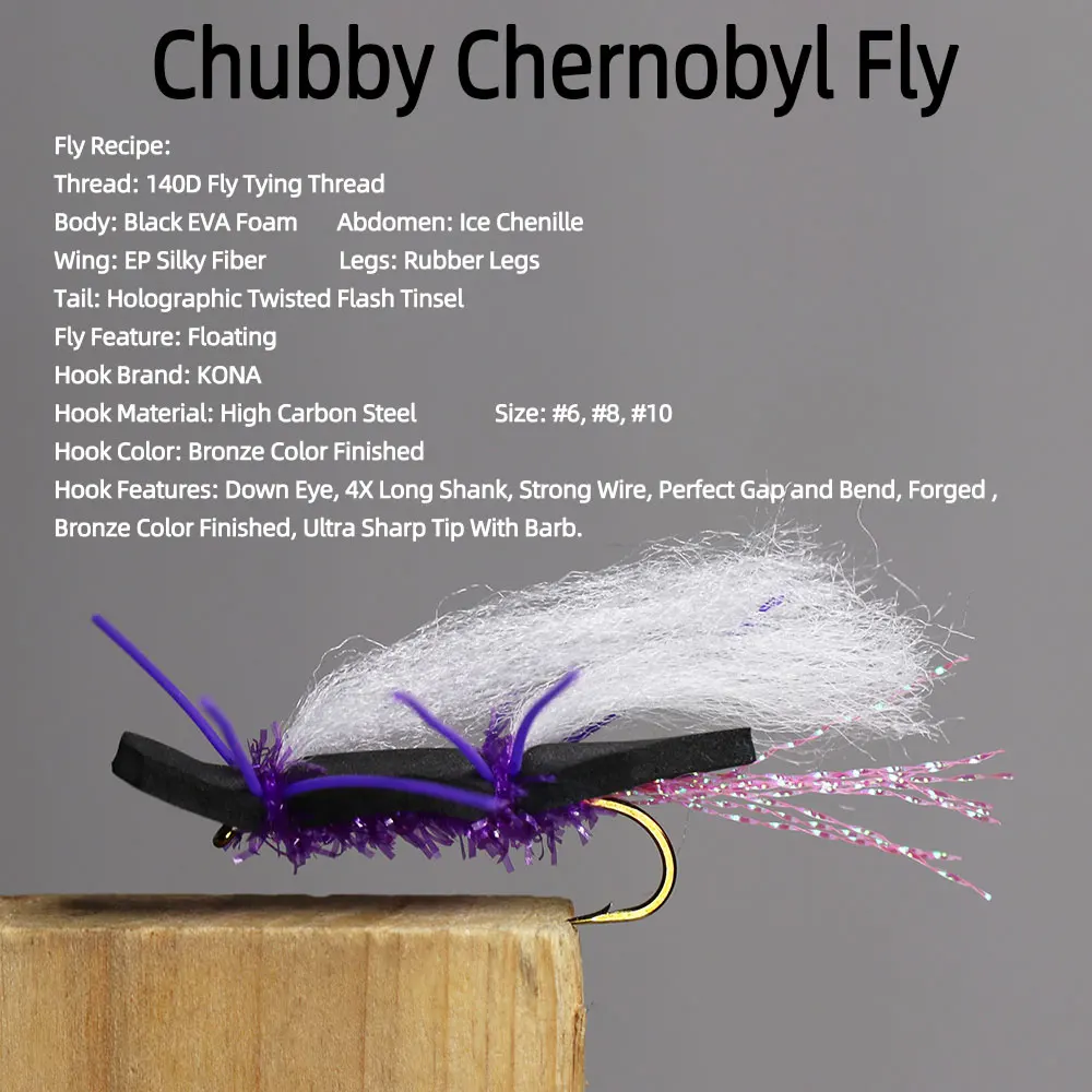 La Chernobyl Chubby es una gran mosca seca y, como tiene mucho pelo y espuma, es bastante fácil de ver en el agua.La espuma ayudará a mantener la mosca sobre el agua y también le dará cuerpo a la mosca.El cabello y las piernas rematan los toques de un saltamontes o Stonefly.