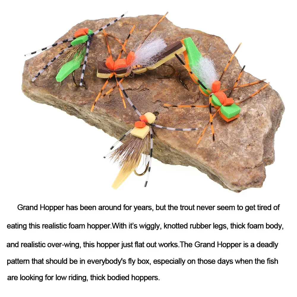 Grass Hopper existe desde hace años, pero la trucha nunca parece cansarse de comer esta tolva de espuma realista.Con sus muñecas, patas de goma anudadas, cuerpo de espuma grueso y sobreala realista, esta tolva simplemente aplana funciona.