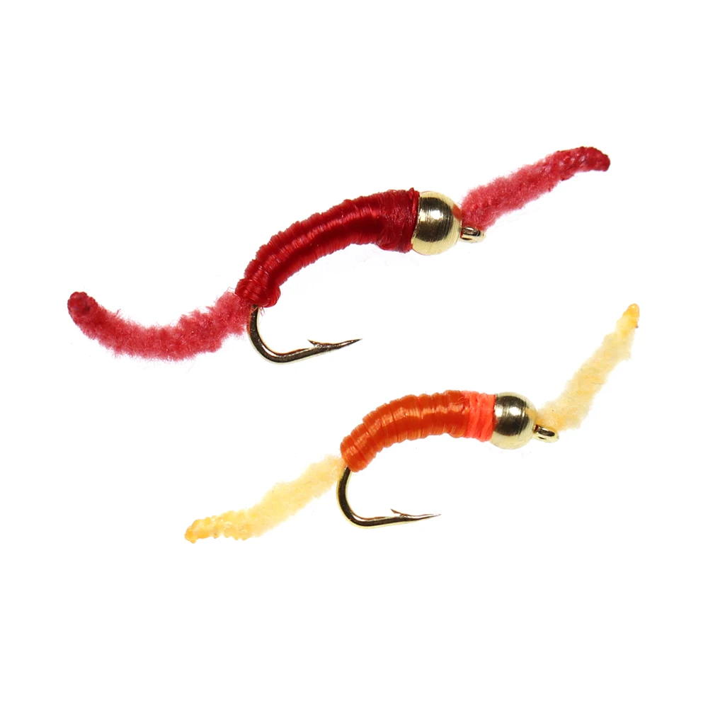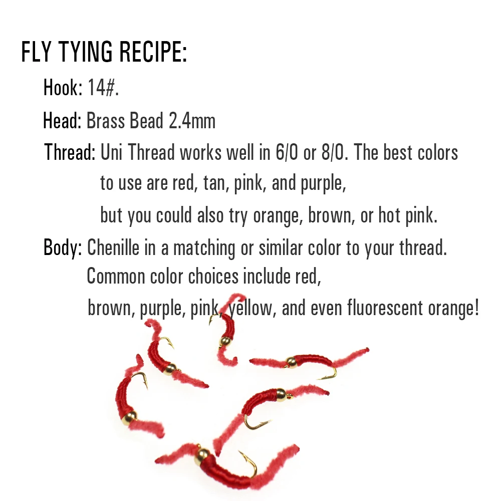 ICERIO's San Juan Worm Fly The indelible San Juan Worm, what more could be said. This fly has accounted for more fish caught on the San Juan than most any other fly. Most people won’t admit it, but it has probably accounted for more trout caught on a lot of rivers! Don’t leave home without a few San Juan Worms in your box. Great for off-color water or wherever aquatic earthworms are present. Experienced workers hand tied fishing flies Packing Unit: 6pcs/box FLY TYING RECIPE: Hook: 14# Head: Brass Bead 2.4mm Thread: Uni Thread works well in 6/0 or 8/0. The best colors to use are red, tan, pink, and purple, but you could also try orange, brown, or hot pink. Body: Chenille in a matching or similar color to your thread. Common color choices include red, brown, purple, pink, yellow, and even fluorescent orange!