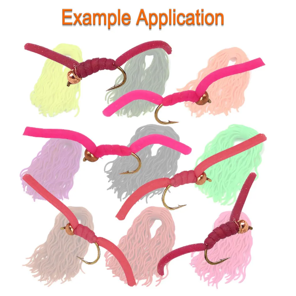 Aplicación: Está disponible para atar moscas y hacer señuelos.Perfecto para atar ninfas, camarones, larvas, gusanos de San Juan y también muy popular para piernas en poppers, insectos bajos y terrestres.