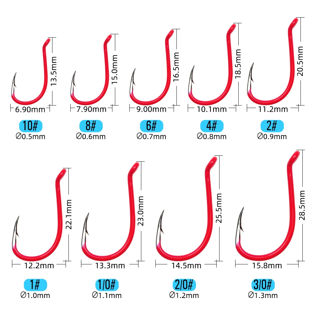 Tamaño: 10/0#, 8/0#, 7/0#, 6/0#, 5/0#, 4/0#, 3/0#, 2/0#, 1/0#, 1#, 2#, 4#, 6#, 8#, 10#.