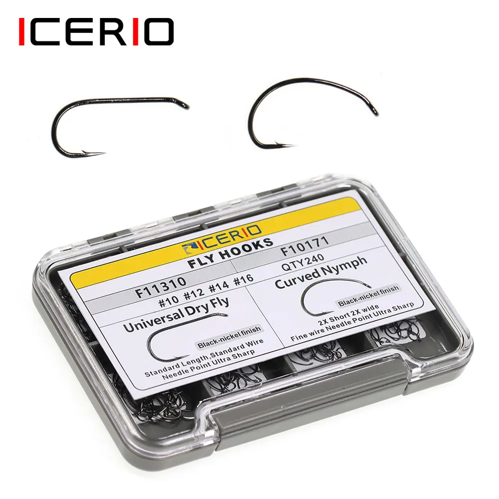 ICERIO 240 unidades/caja#10~#Gancho para atar moscas secas estándar de púas, anzuelo para atar moscas Caddis curvado, caja de almacenamiento impermeable para anzuelos de pesca, 16