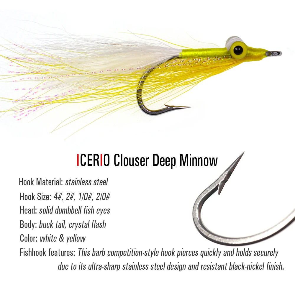 El piscardo profundo cluuser es una mosca artificial comúnmente clasificada como una serpentina y se pesca bajo la superficie del agua. Es un patrón popular y ampliamente utilizado para peces de juego de agua dulce y agua salada y generalmente está listado como uno de los patrones más populares para tener en cualquier caja de moscas, especialmente para la pesca de bajos y agua salada.