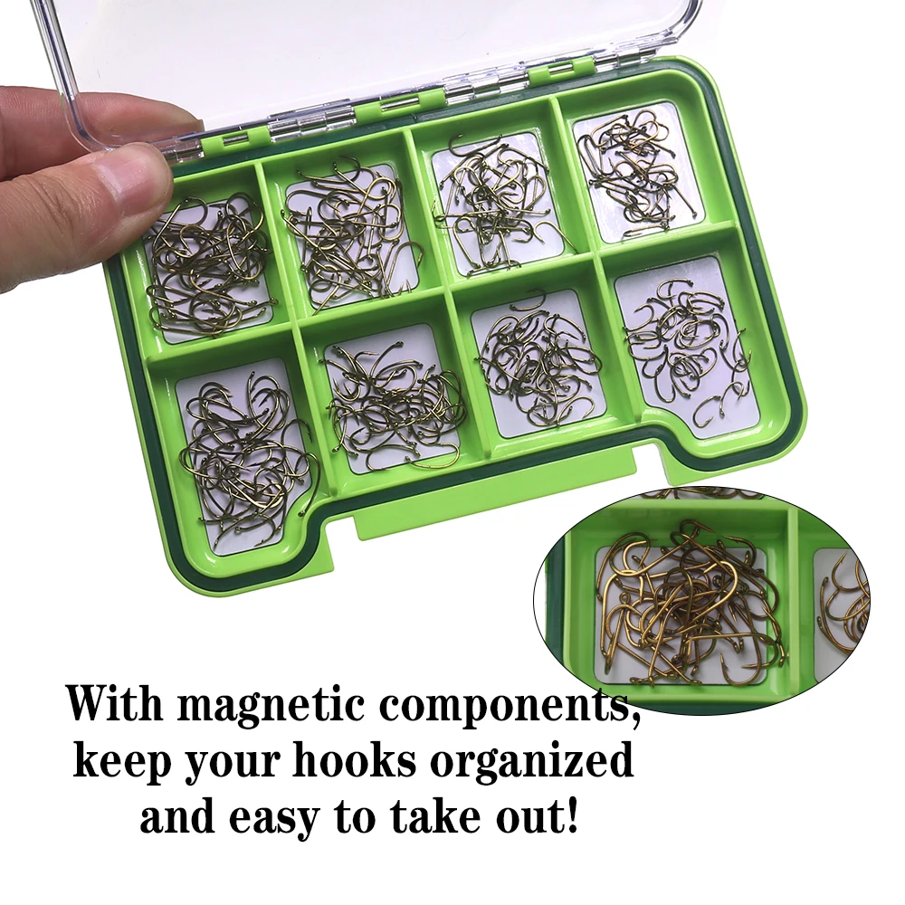 FÁCIL DE USAR: los anzuelos clásicos para atar moscas vienen empaquetados en un palé de anzuelos de 8 compartimentos (Fondo magnético con divisores).