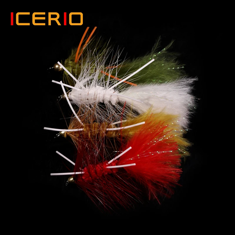ICERIO, 6 uds., cabeza de cuentas de latón, patas de goma, serpentinas de lana, señuelos de mosca de pesca, anzuelo de atado de agua salada rojo Oliva, cebo para trucha y moscas