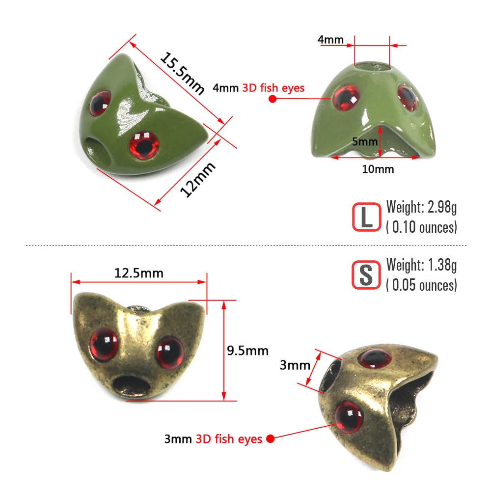 La máxima cabeza pesada para natación profunda, serpentinas de gancho. Atar Serpentinas de peso pesado con perfiles realistas, planos y anchos; La imitación perfecta para especies de peces comunes de vivienda inferior como esculpir, gobies y pez gato bebé. Diseñado para usar tanto en serpentinas de gancho como de tubo, el casco Sculpin tiene una quilla pesada para mantener su velcro de natación y evitar enredos. Cantidad por paquete: 50 piezas (incluye 100 piezas 3D fish eye). Color: bronce, negro, marrón, Oliva, dorado, plateado. Material: aleación ligera compuesta principalmente de Zinc, no hay plomo en el producto por lo que es respetuoso con el medio ambiente. Especificaciones: Mini: se adapta a los tamaños de gancho #10, #8, #6, #4, #2. Pequeño: se adapta a los tamaños de gancho #6, #4, #2, #1. Grande: se adapta a los tamaños de gancho n. ° 2, n. ° 1, 1/0, 2/0. El tamaño Mini pesa 0,55 gramos (0,02 onzas). Le recomendamos que use un carrete/peso de línea mínimo de #4 o mayor. El tamaño pequeño pesa 1,38 gramos (0,05 onzas). Le recomendamos que utilice un tamaño mínimo de peso de varilla/línea #5/6 y superior. El tamaño grande pesa 2,98 gramos (0,10 onzas). Le recomendamos que utilice un tamaño mínimo de peso de varilla/línea #7/8 y superior. Nota: El Mini está diseñado con una ranura frontal especialmente ampliada para adaptarse a una gama más amplia de tamaños de gancho. Esta mayor flexibilidad en tamaños de ganchos permite utilizar el Mini en una amplia variedad de patrones de serpentina de agua dulce y agua salada. Características: Perfil realista Perfil plano y amplio que imita a especies de peces comunes de vivienda inferior como esculpir, gobies y peces gato para bebés. Diseño de ajuste frontal Simplemente primero ate todos los materiales, luego ajuste el casco Sculpin desde la parte delantera. Rápido y fácil de usar. Ranura frontal Permite su uso tanto en moscas de gancho como de tubo. Ojos vivos Incluidos en un tamaño y color correspondientes, estos ojos ultrarealistas funcionan como un disparador importante para peces depredadores. Quilla pesada Distribuye la mayor parte del peso del casco hasta la parte inferior de la serpentina, asegurando que nade en la posición correcta. Esto también le permite atar con el gancho hacia abajo o hacia arriba. Hemos hecho que el casco esculpir sea significativamente más pesado que la cabeza del pez cebo, por lo que se hundirá rápidamente en ríos en movimiento rápido y peces más profundos cerca del fondo donde los escultores suelen vivir. Colores vivos Disponible en marrón, negro y oliva (y también en plata en el tamaño mini). El acabado mate (no brillante) es perfecto para el tipo de especies blandas y de vivienda inferior que estás tratando de imitar. El recubrimiento especial de óxido da un efecto irregular, casi abultado, que tiene diferentes tonos de color. Por ejemplo, el casco Sculpin de color marrón es principalmente de color marrón oscuro, pero también reflejará tonos de negro y bronceado en diferentes ángulos, dando un tipo de efecto de camuflaje.