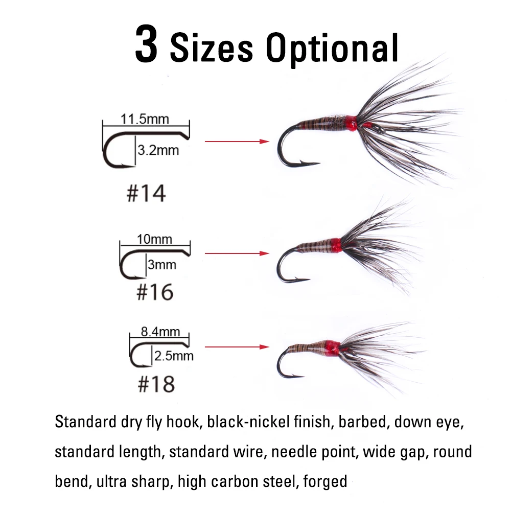 Característica del gancho: Gancho para mosca seca estándar, acabado de níquel negro, púas, ojo hacia abajo, longitud estándar, alambre estándar, punta de aguja, espacio amplio, curvatura redonda, ultra afilado, acero con alto contenido de carbono, forjado