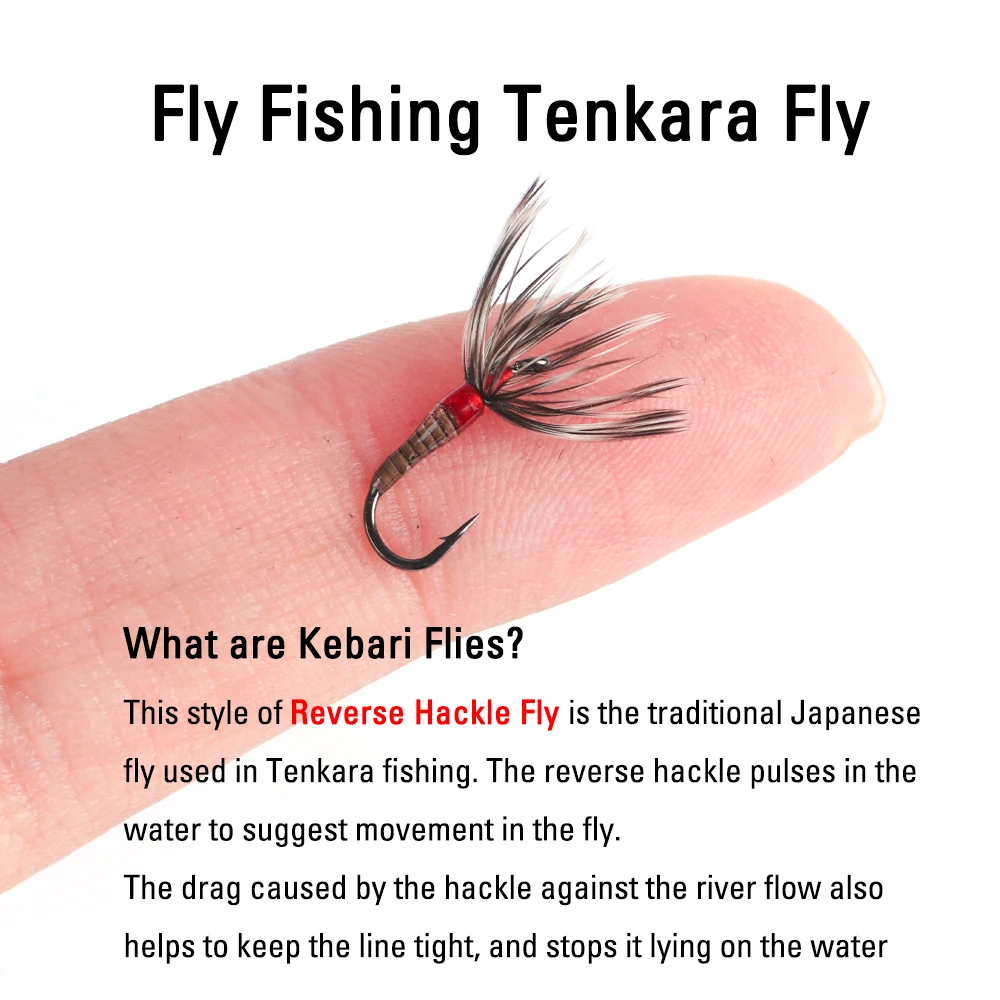 Este estilo de mosca Hackle inversa es la mosca tradicional japonesa utilizada en la pesca de Tenkara.El hackle inverso pulsa en el agua para sugerir movimiento a la marcha.