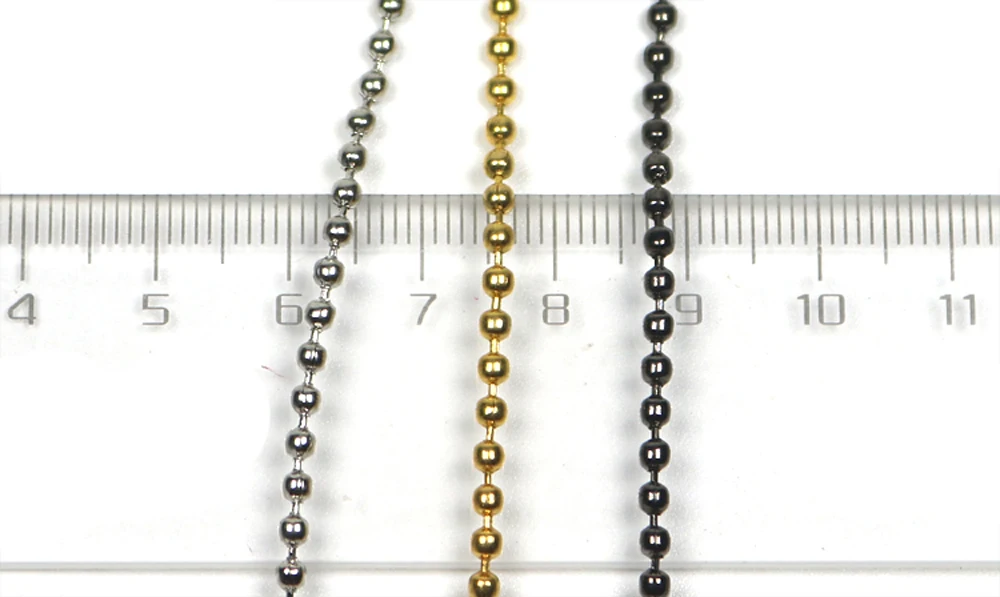 1 pieza=45cm/paquete Tamaño: 2,4mm, 3,2mm, 4,0mm, ojos de cuentas de cadena de metal. Hundimiento Cantidad aproximada de cuentas: 2,4mm: 45cm aproximadamente 128 + cuentas (64 pares); 3,2mm: 45cm aproximadamente 100 + cuentas (50 pares); 4,0mm: 45cm aproximadamente 72 + cuentas (36 pares); Oro, plata para la opción. Aplicación: para añadir peso, moscas ninfas. Paquete: bolsa transparente