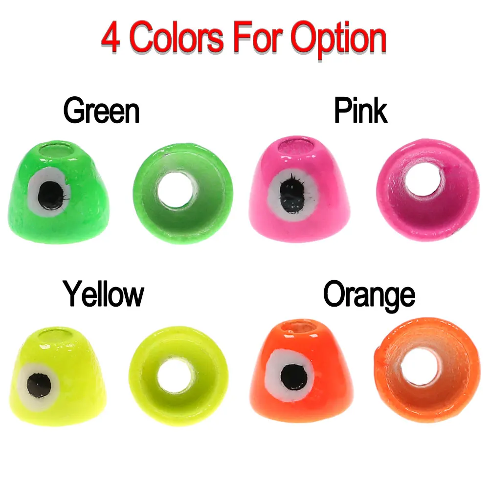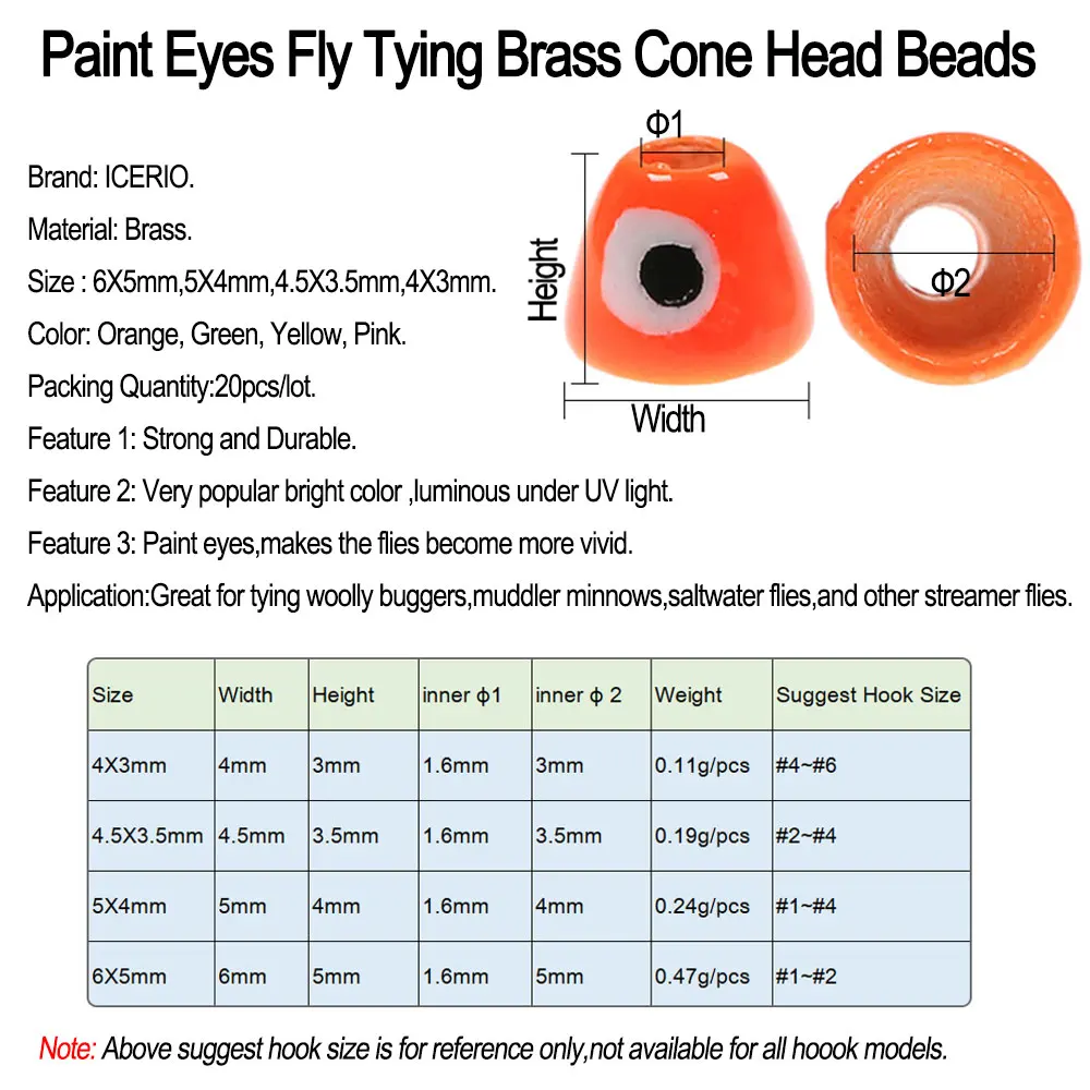 ICERIO 20 piezas pintura UV ojo atado de moscas cuentas de cabeza de cono de latón para atar bugger peludo Minnow Streamer cabeza de moscas de pesca en agua salada