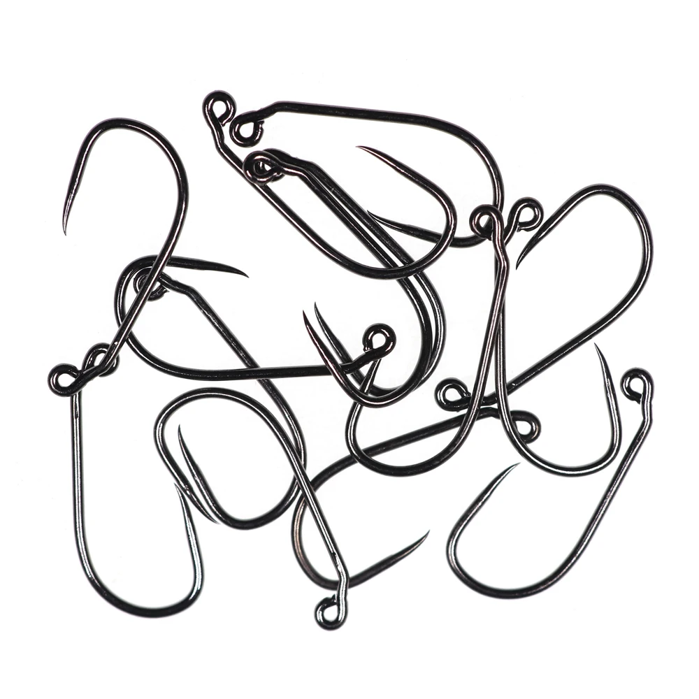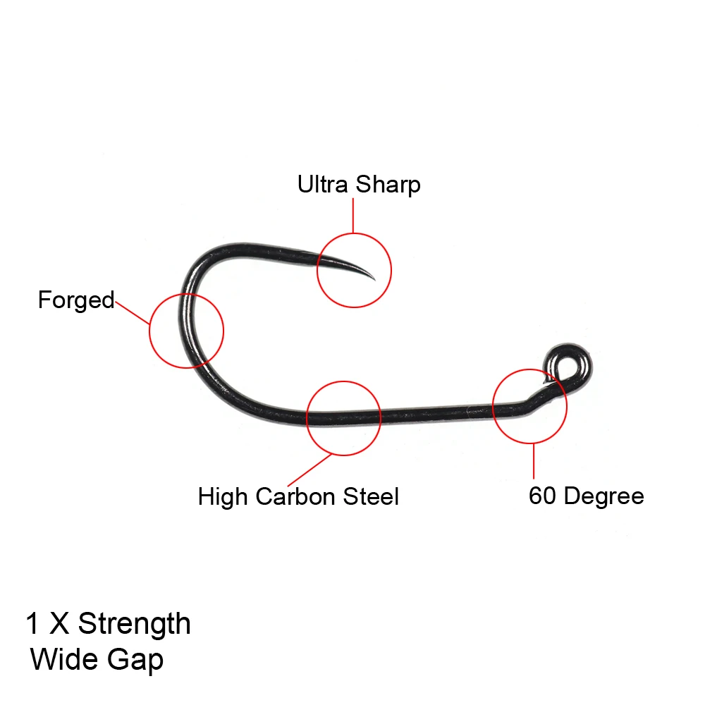 Especificaciones: ninfa de plantilla, acabado negro-níquel, sin púas, ojo en ángulo de 60 grados, longitud estándar, resistencia 1X, espacio ancho, ultra afilado, acero de alto carbono, forjado.