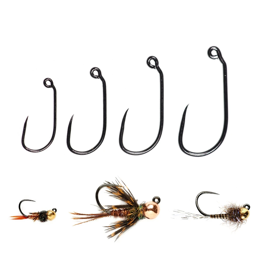 ICERIO, 30 Uds., ojo en ángulo de 60 grados, hueco ancho, anzuelo sin púas, anzuelo para atar moscas de ninfa, anzuelo para trucha de acero al carbono, acabado en negro y níquel