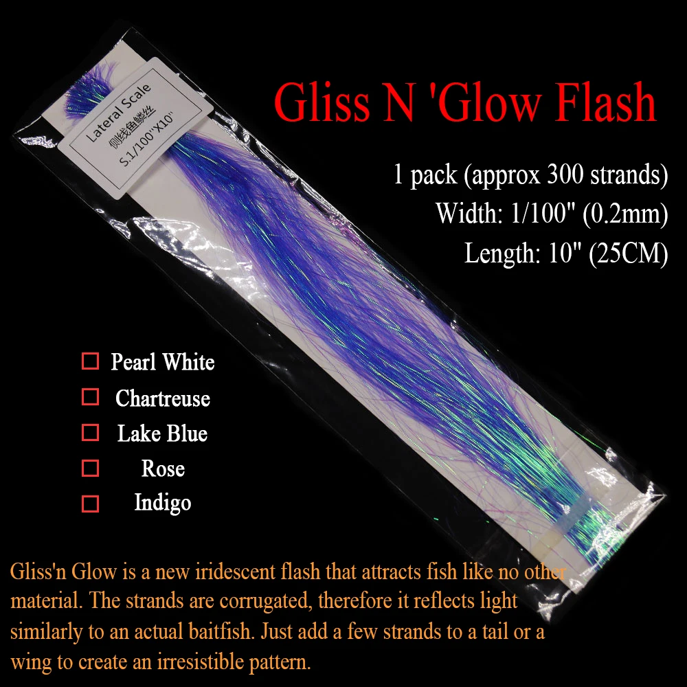 Gliss N 'Glow es un flash muy bonito que atrae a los pescadores. Las fibras de Gliss N' Glow son delgadas y tienen una construcción ondulada. Las fibras reflejan la luz y crean vibraciones en el agua que los peces notan. Gliss N 'Glow se puede utilizar en alas y colas. Simplemente agregue algunas hebras a una cola o un ala para crear un patrón irresistible.