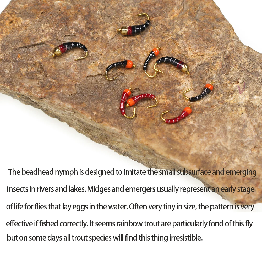 La ninfa de cuentas está diseñada para imitar la pequeña subsuperficie e los insectos emergentes en ríos y lagos.Los miedos y los emergentes suelen representar una etapa temprana de vida para las moscas que coloca huevos en el agua.A menudo, de tamaño muy pequeño, derrita este patrón de larvas a través de aguas traseras o agua fija. Parece que la trucha arcoíris le gusta especialmente esta ninfa roja, todas las especies de trucha encontrarán esta cosa irresistible.Los intermediarios son activos durante todo el año. Los pistas dicen que es suerte llevar algunos de estos.