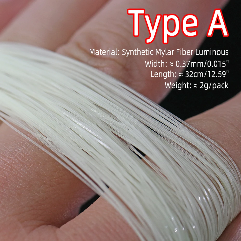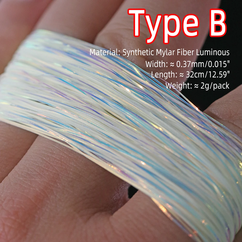 El tipo B es holográfico, luminoso y Flashabou, más atractivo para la pesca en aguas profundas. ¡Ideal para atar salmones, truchas, lucios, almizclados y moscas de agua salada, así como jigs, spinnerbaits y faldas bucktail!