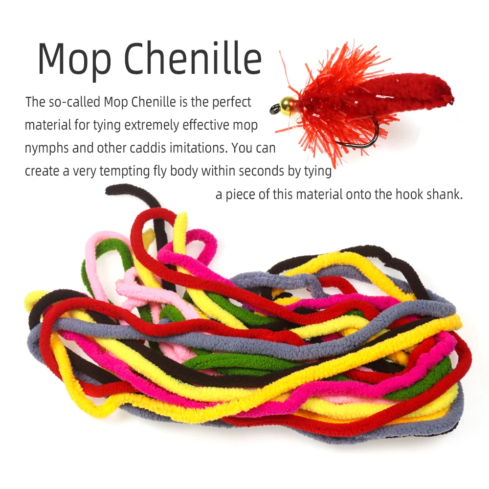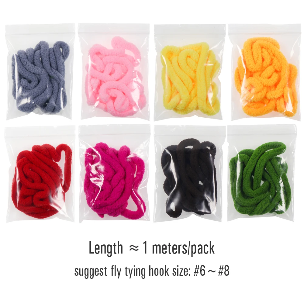 -Esta chenilla es súper fuerte y se expande cuando está húmeda. No solo se utiliza para atar moscas de la fregona, sino que también está disponible para atar moscas de piedra, ninfas emergentes y patrones de huevos pequeños, etc. Tamaño sugerido del gancho para atar moscas: #6 ~ #8