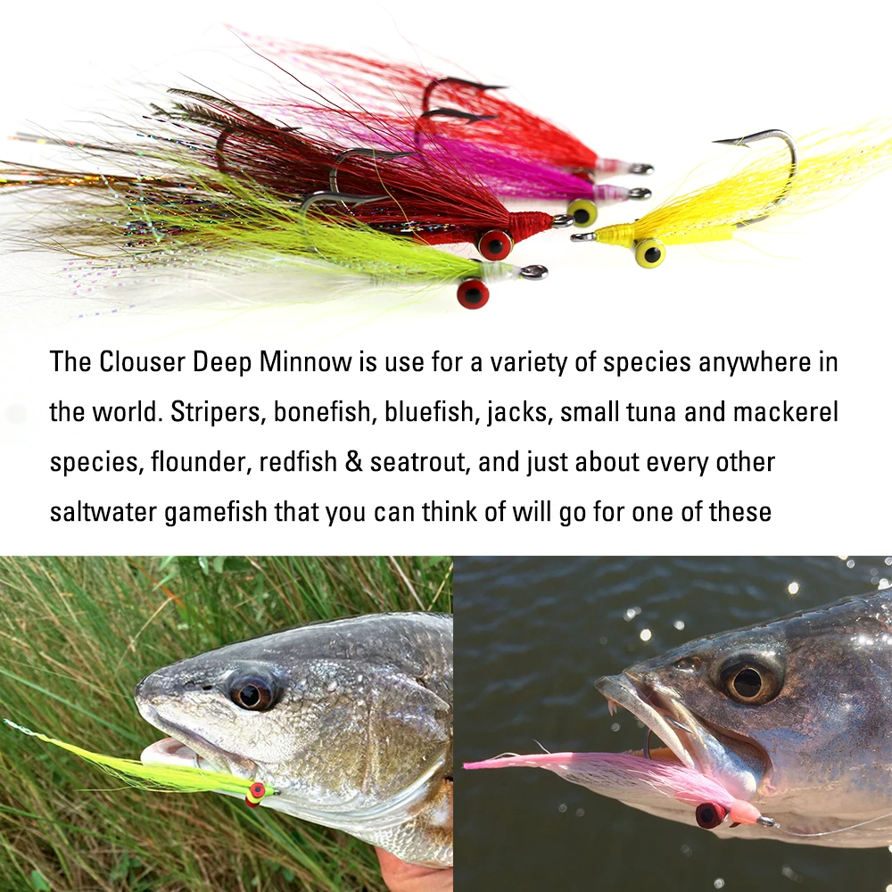 El Clouser Deep Minnow es una mosca artificial comúnmente clasificada como un streamer y se pesca bajo la superficie del agua. Es un patrón popular y ampliamente utilizado tanto para peces de agua dulce como salada y generalmente aparece como uno de los mejores patrones para tener en cualquier caja de moscas. Se utiliza para una variedad de especies en cualquier parte del mundo. Stripers, bonefish, Bluefish, Jacks, pequeñas especies de atún y caballa, platija, gallineta nórdica y seatrout, y casi todos los demás peces de agua salada que puedas imaginar elegirán uno de estos.
