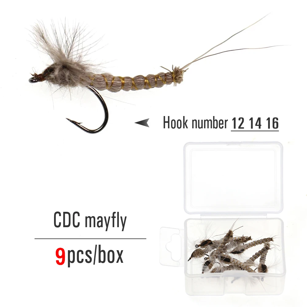 ICERIO 9 piezas #10 #12 #14 CDC Mayfly Deerhair cuerpo moscas secas mosca realista señuelo de pesca cebos de trucha