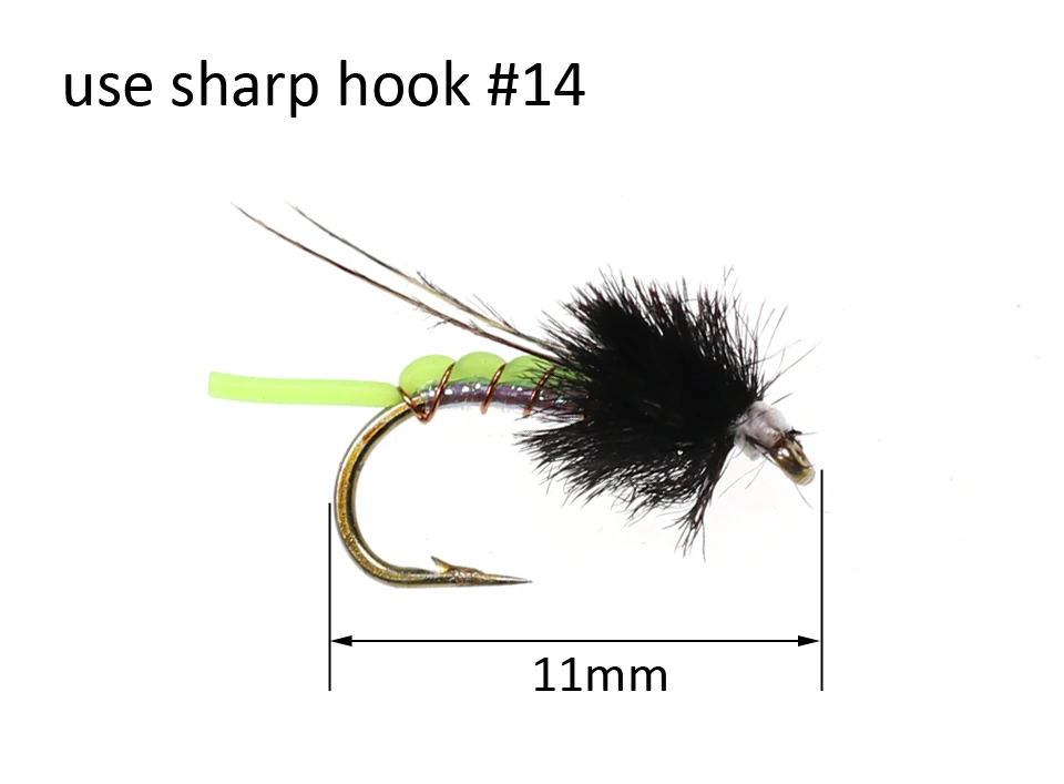 Esta mosca de gusano de roca verde con cabeza de cuenta representa una serie de Caddis larva que están disponibles para la trucha durante todo el año. El gusano de roca verde se puede utilizar como una ninfa de búsqueda, o para combinar con los tipos de alimentos disponibles en un determinado Arroyo. Es brillante y atrae la atención de los peces,. Por lo que se puede utilizar eficazmente como una mosca de plomo en un aparejo de Ninfa en tándem para atraer a los peces que a menudo tomará el patrón realista de pequeño arrastre. Este patrón de gusano de roca verde representa caddis de vida libre y lleva trucha picky en ríos muy duros. Esta es una mosca muy popular en Utah. Trabajadores experimentados atados a mano, moscas de pesca Receta de la mosca: Tamaño del gancho: tamaño 14 Lista del paquete: 8 unids/caja