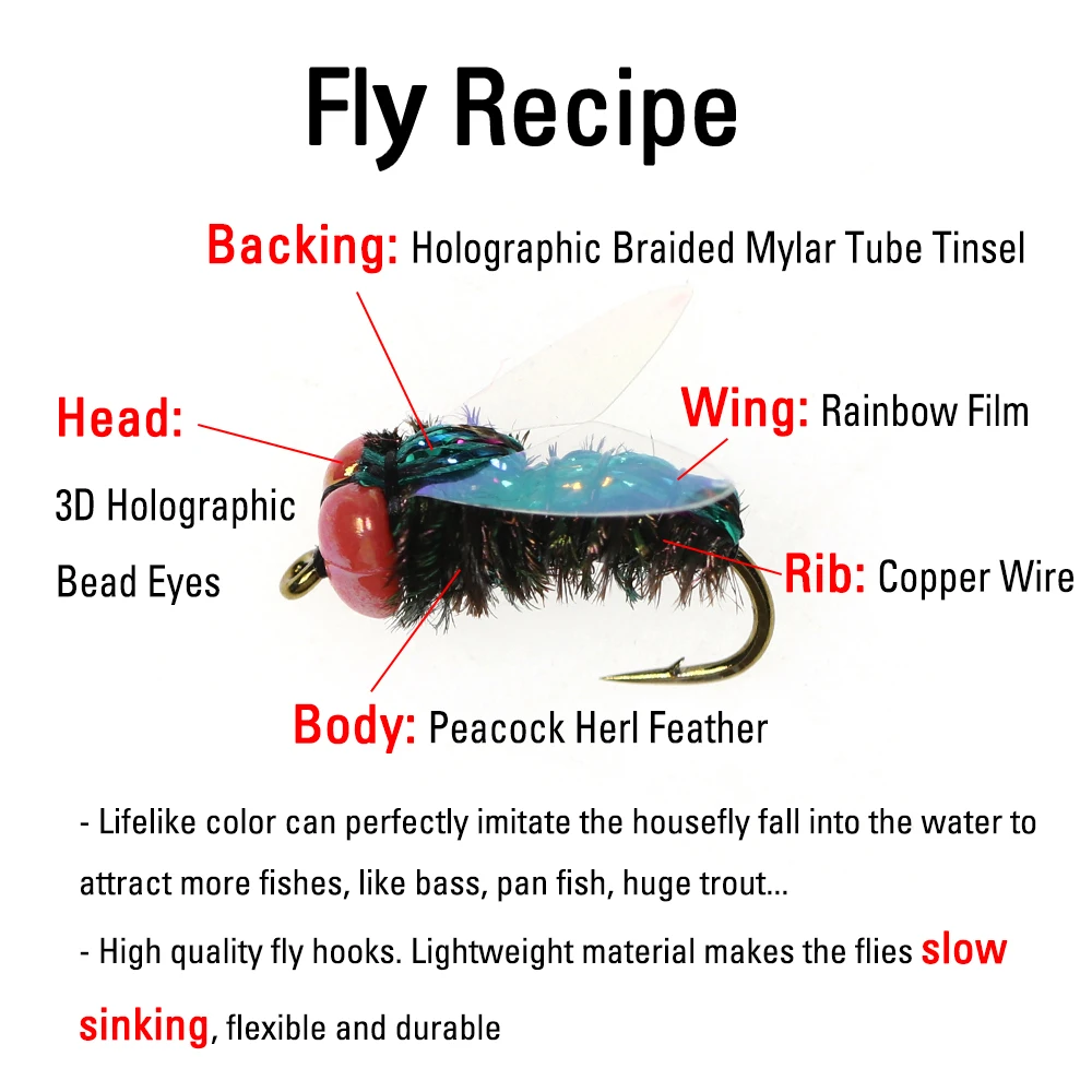 El color realista puede imitar perfectamente la caída de la mosca del hogar en el agua para atraer más peces, como lubina, pan fish, trucha enorme... Gancho de mosca de alta calidad. El material ligero hace que las moscas se hundan lentamente, sean flexibles y duraderas. Nuestras moscas están atadas por profesionales calificados con años de experiencia.