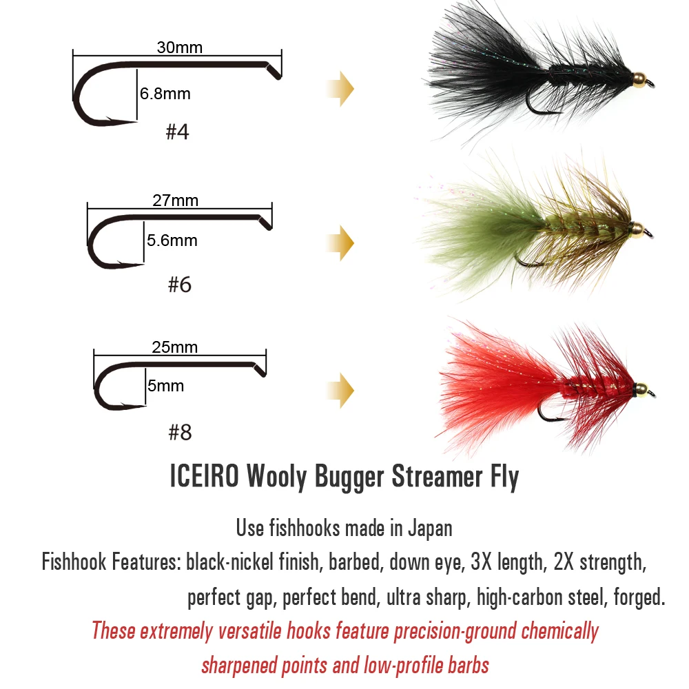 El Bugger lanudo es un patrón que tiene un éxito universal. La cuenta le da a la mosca una acción irresistible, y la cola de marabú ondula en el agua para volver locos a los peces. Mantenga un buen surtido de este patrón. Trabajadores experimentados, moscas de pesca atadas a mano. RECETA DE MOSCAS: Tamaño del anzuelo: tamaño 4, 6, 8 Características del anzuelo: acabado negro-níquel, púas, ojo abajo, 3X longitud, 2X fuerza, espacio perfecto, curva perfecta, ultra afilado, acero de alto carbono, forjado. Cola: pluma de marabú Cabeza: cuenta de latón Lista del paquete: 6 piezas/caja Color: rojo, negro, Oliva, Blanco, Marrón Anzuelo países productores: calidad japonesa-Atado en anzuelos de mosca hechos en Japón por nuestros niveles de mosca profesionales; Vuela las especies objetivo típicas: atrapa Lucio, lubina, panfish, Arroyo, degollado, marrón, Y trucha arcoíris por menos Pero pescar mucho más. Woolly Buggers son un excelente streamer multiusos con gran acción; ICERIO pesca con confianza.