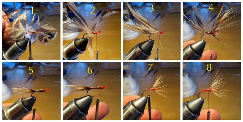 Pensé que intentaría atar un Takayama Sakasa Kebari, que es un cuerpo de hilo Sakasa Kebari con un collar de pavo real herl. Peacock herl refleja la luz UV de una manera que la trucha rara vez puede resistir. Es probablemente uno de los mejores materiales de atado natural que existen.