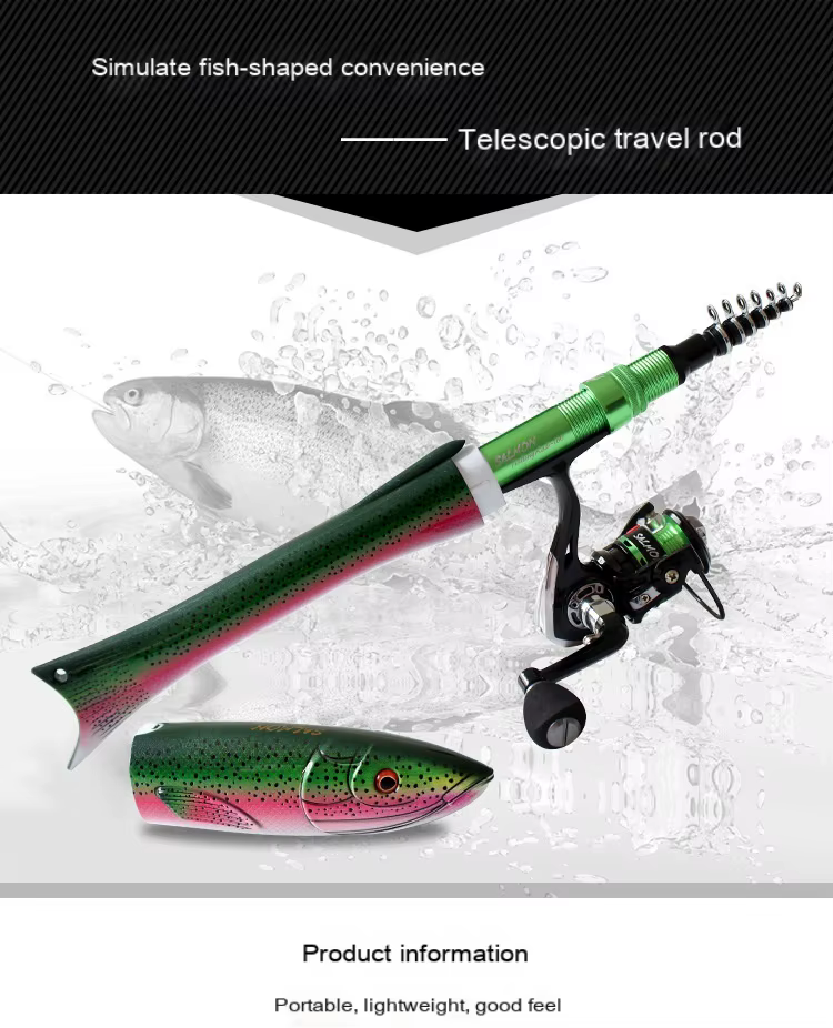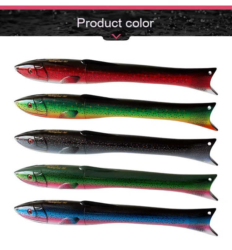 La carcasa de este producto está hecha de material ABS, con ojos de pez simulados en 3D, con agujeros en la cola, que se puede utilizar con ganchos, la base de la rueda está hecha de material de aleación de aluminio,. El anillo guía está hecho de acero inoxidable, El cuerpo principal del cuerpo de la varilla es de tela epoxi y varilla de carbono ligeramente, y se utiliza la rueda de la línea de pesca. La relación de rotación es 4,4: 1, y el número de rodamientos es 5 + 1. Longitud después de la contracción 30cm.