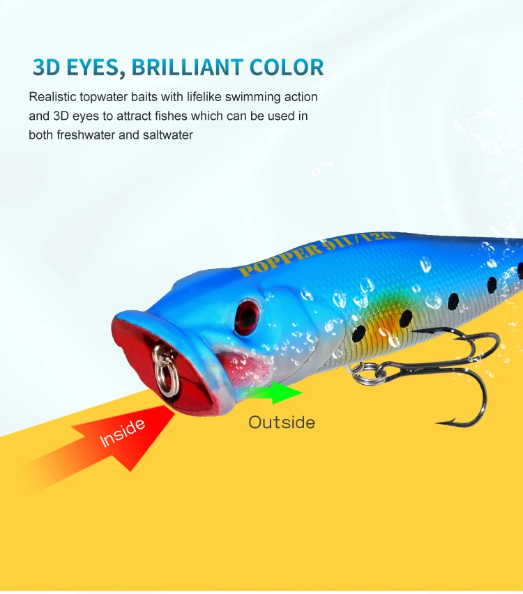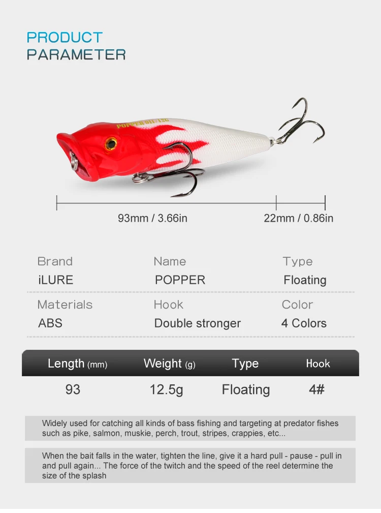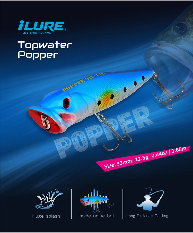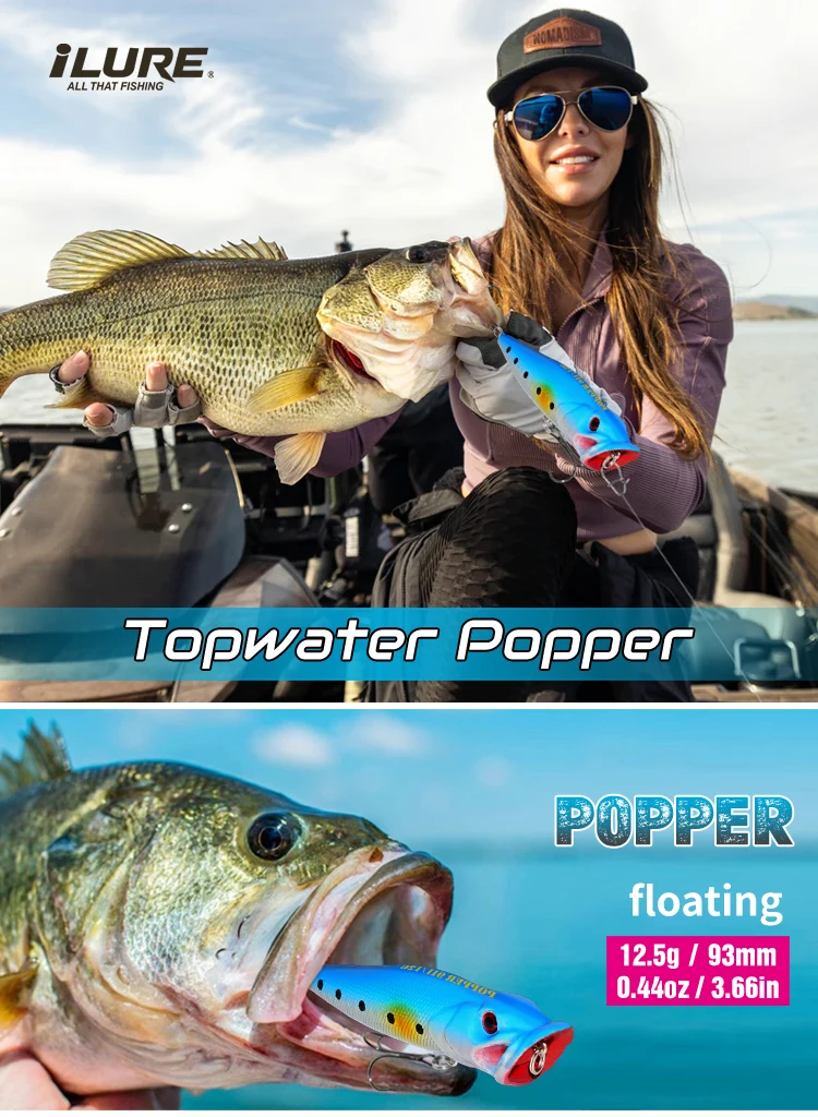 ILURE-Señuelo de pesca Popper, cebo duro artificial con ojos 3D de 12,5g y 93mm, Wobblers, Crankbait flotante, aparejos de pesca