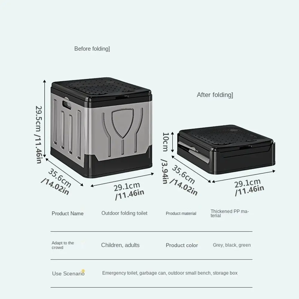 4. Multifunctional: The portable toilet can not only be used as a toilet for outdoor, but also a portable seat, garbage can, storage box, etc.