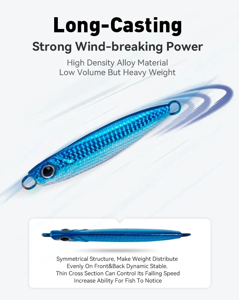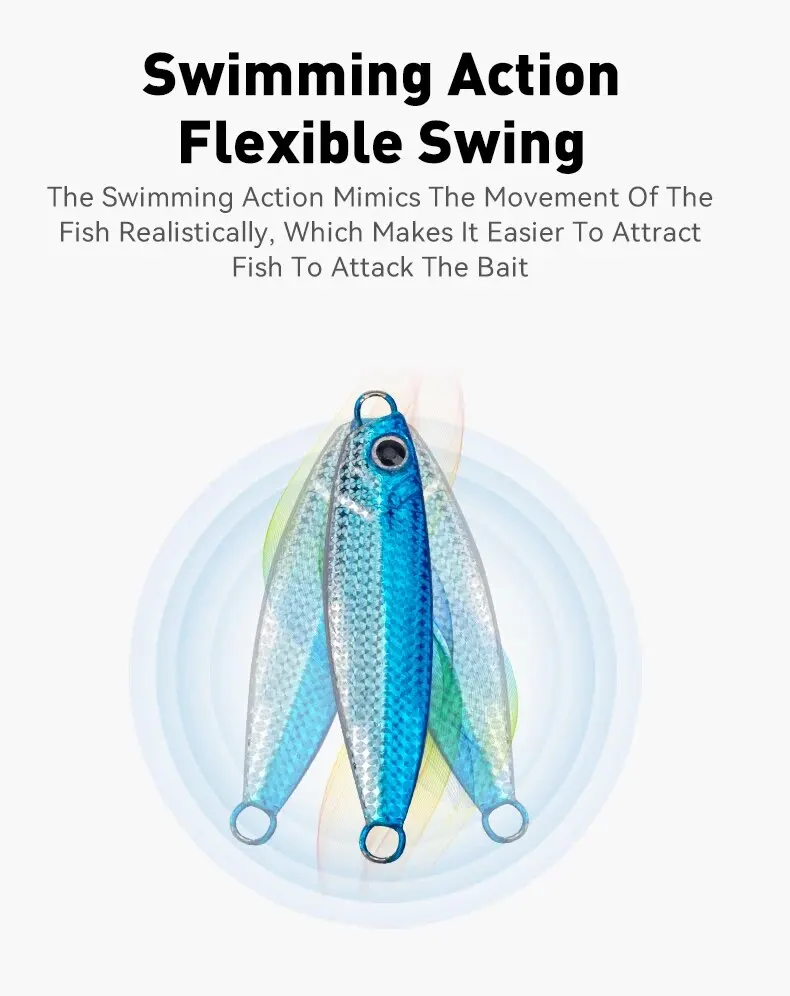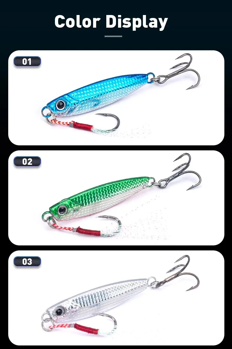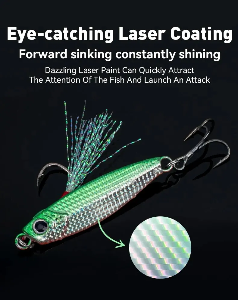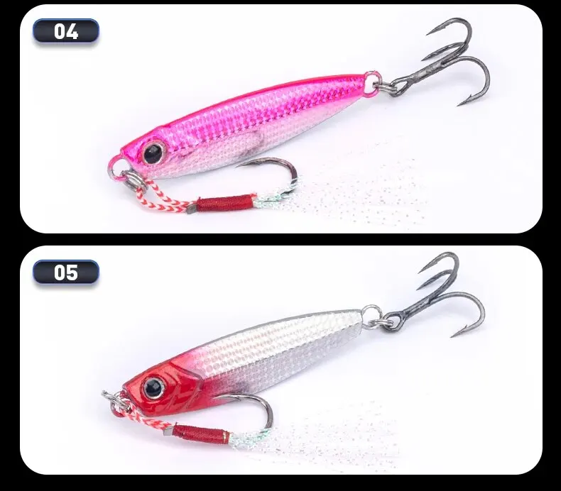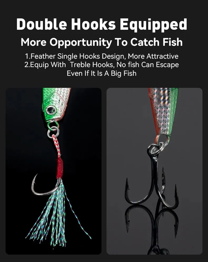 • Jigpara de metal de hundimiento rápido: El jigpara de hundimiento rápido de metal garantiza que este señuelo se hunda rápidamente, lo que lo hace ideal para capturar peces que nadan profundamente en el agua.