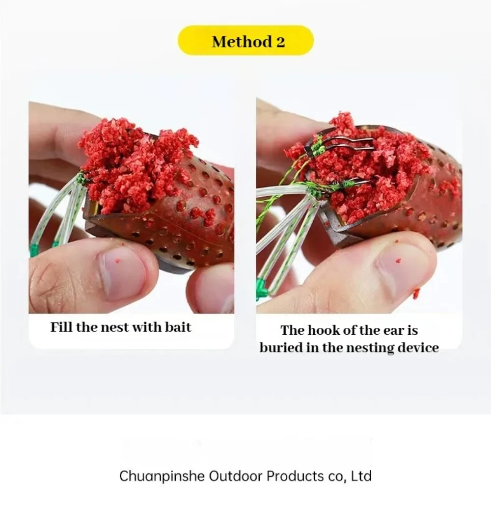 -Diseño innovador de pesca con mosca: jaula de cebo especializada para la pesca con mosca.Funciona muy bien en entornos complejos como embalses de montaña, pendientes y agua corriente.Se puede utilizar con cuentas flotantes para una mejor atracción.