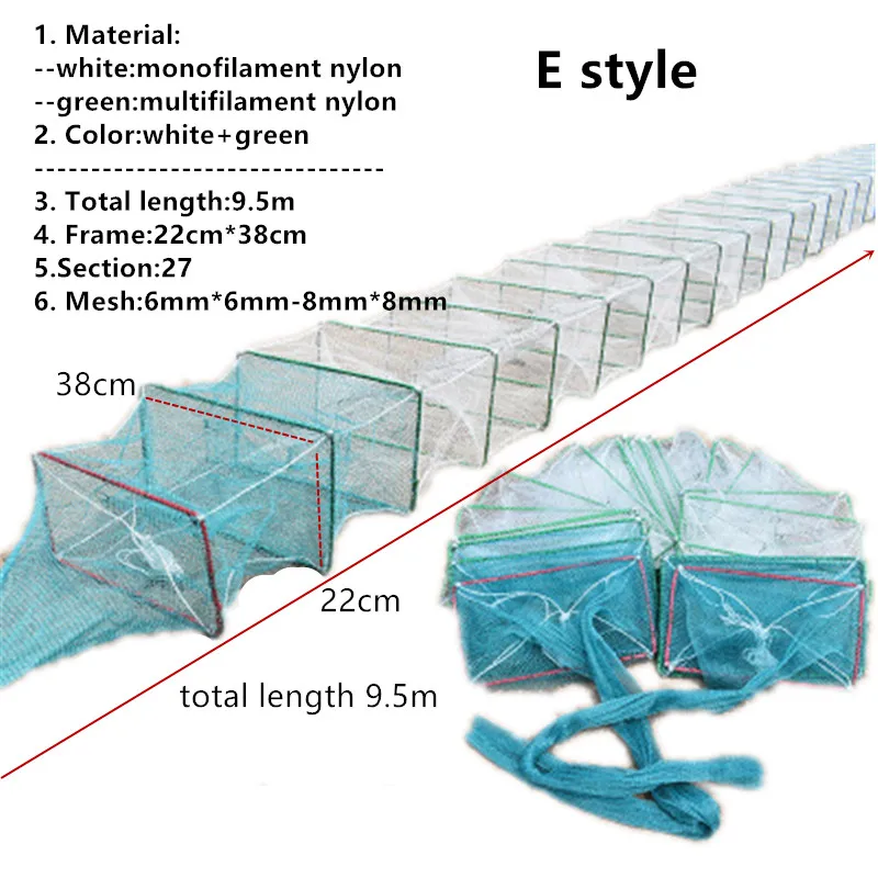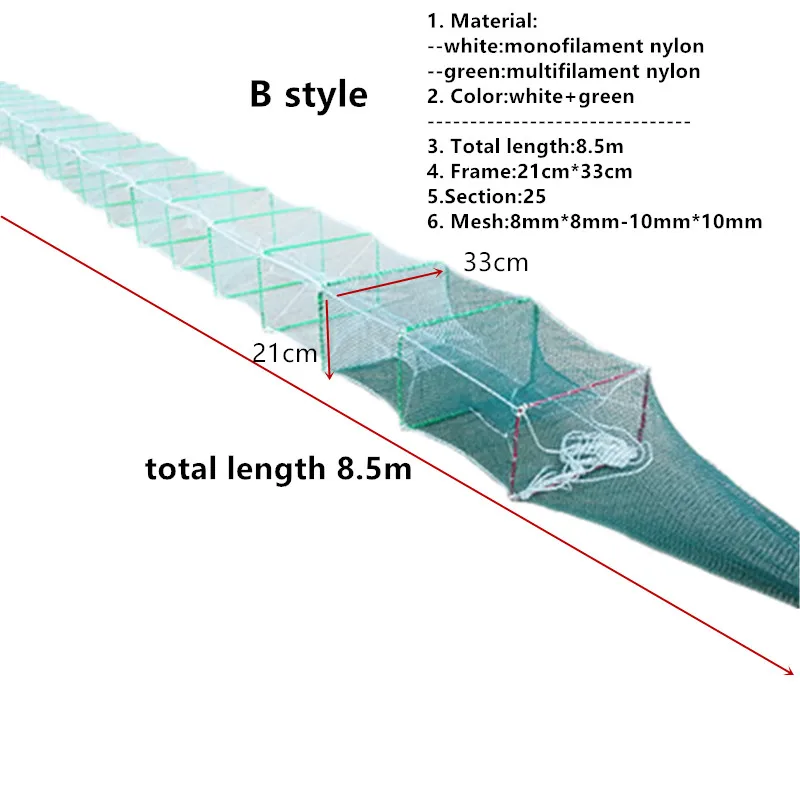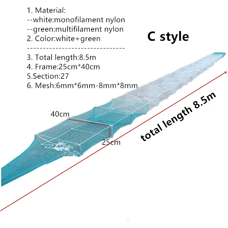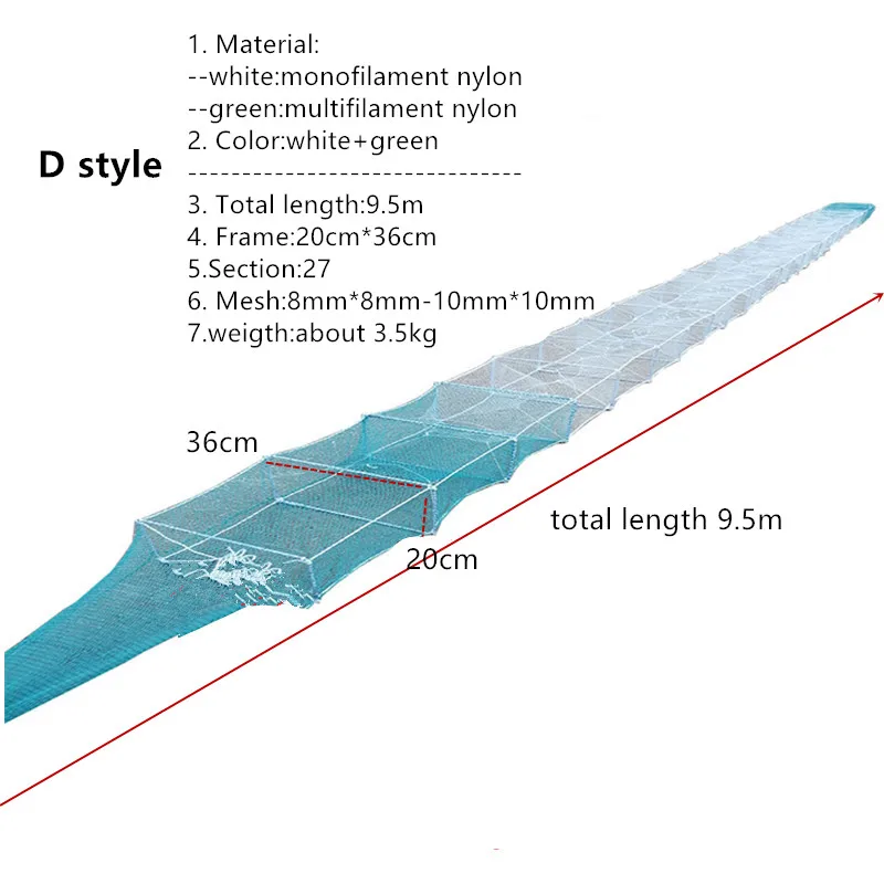 Jaula de pesca grande para camarones, red de pesca para exterior, trampa para peces, Crayfish, accesorios para exteriores, longitud de 6,5 m-9,5 m