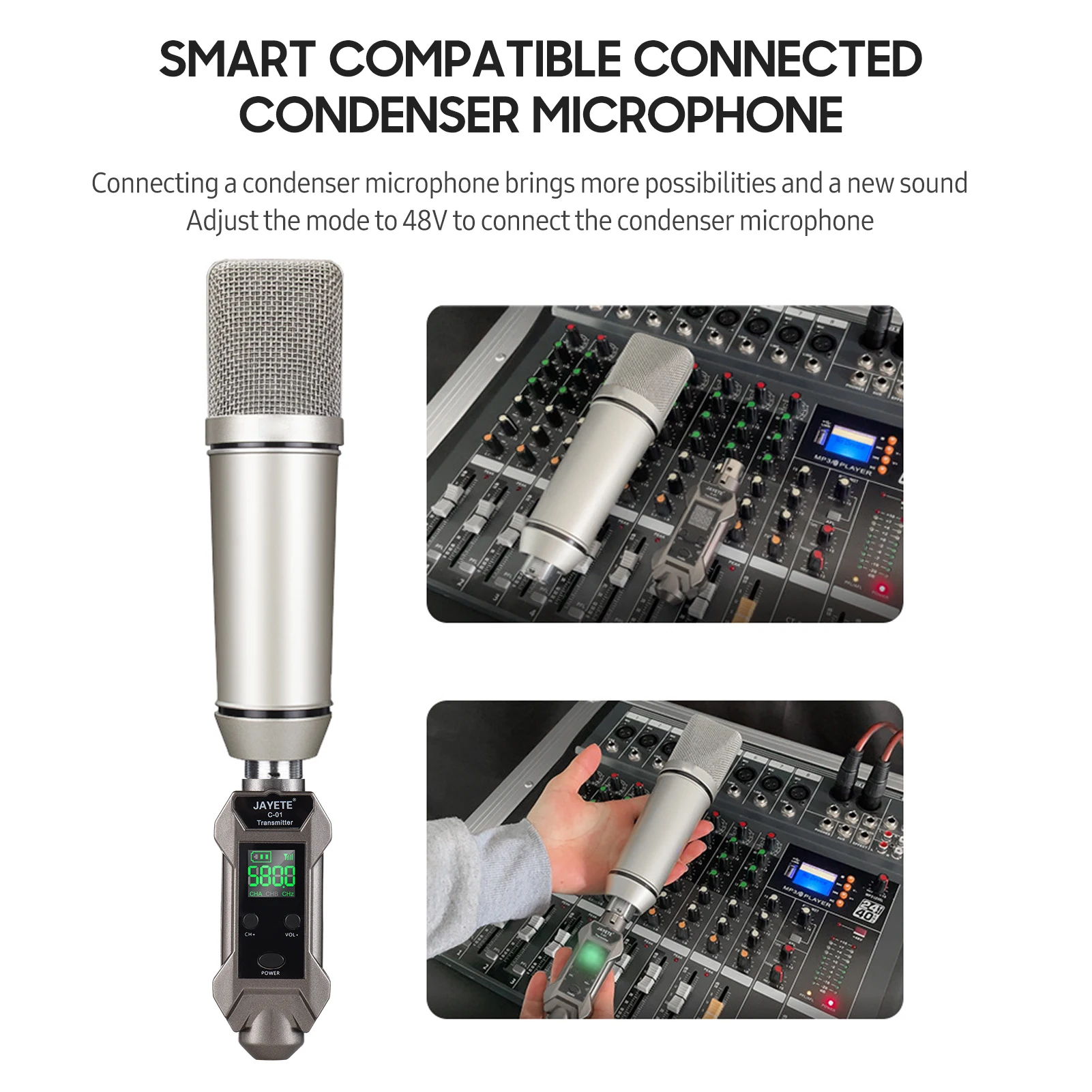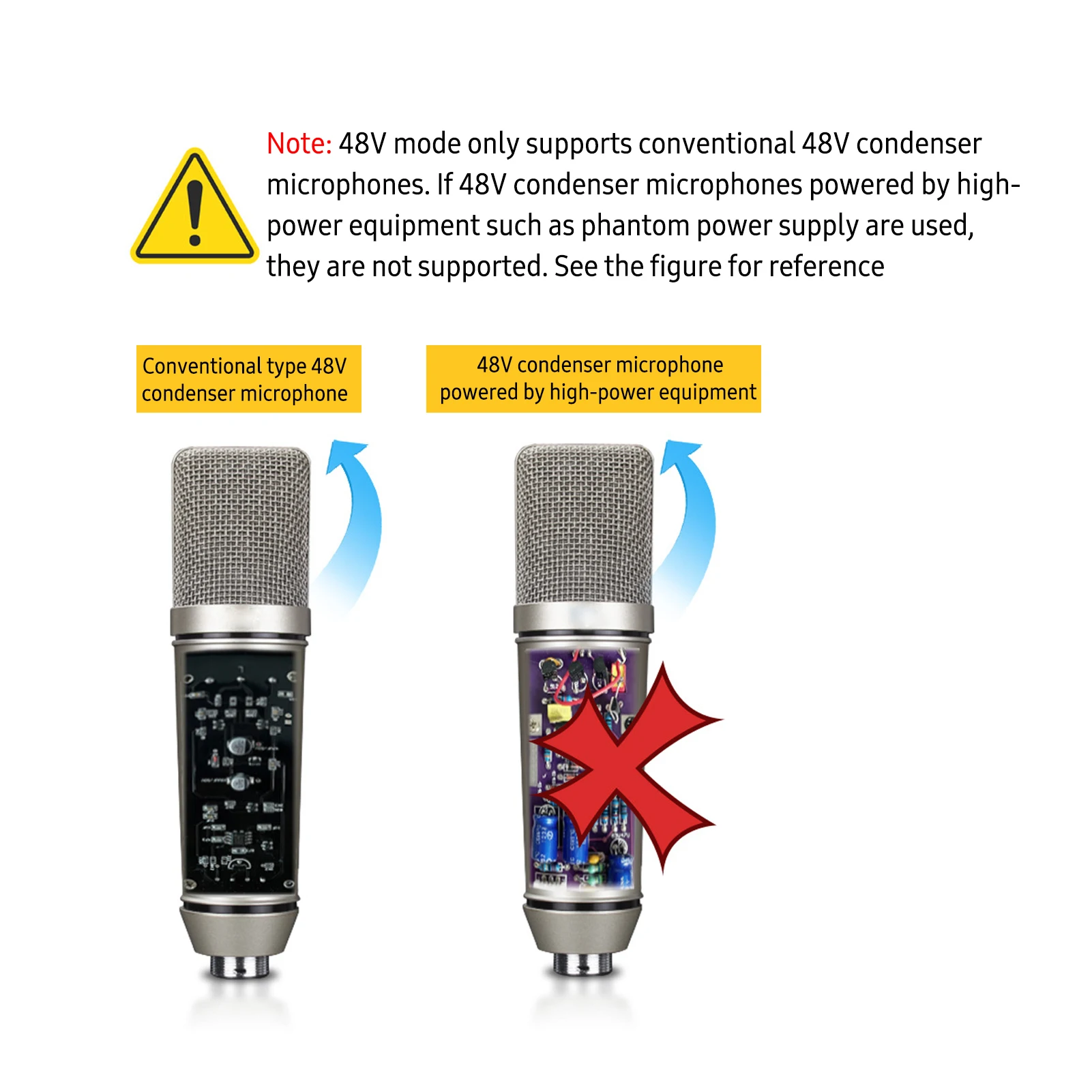 Ajuste de voltaje de 0V, 5V y 48V, compatible con micrófono dinámico y micrófono de condensador para realizar el canto inalámbrico: 0V para micrófono dinámico, 5V para micrófono de condensador o micrófono de grabación de audio, 48V para micrófono de condensador fantasma.