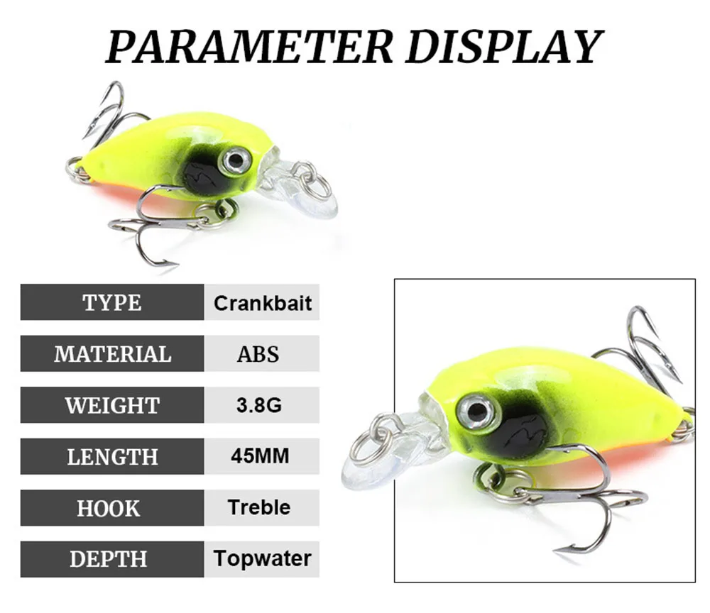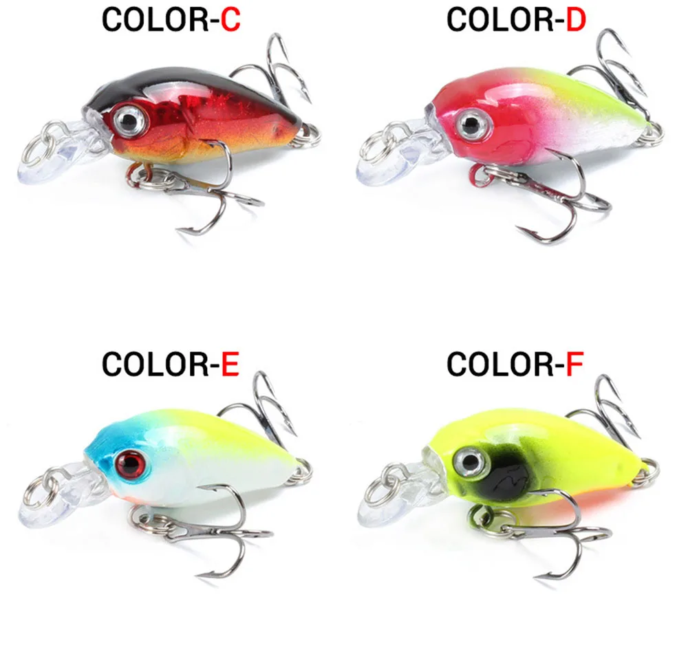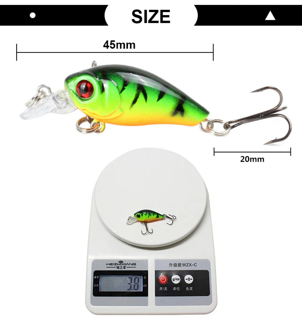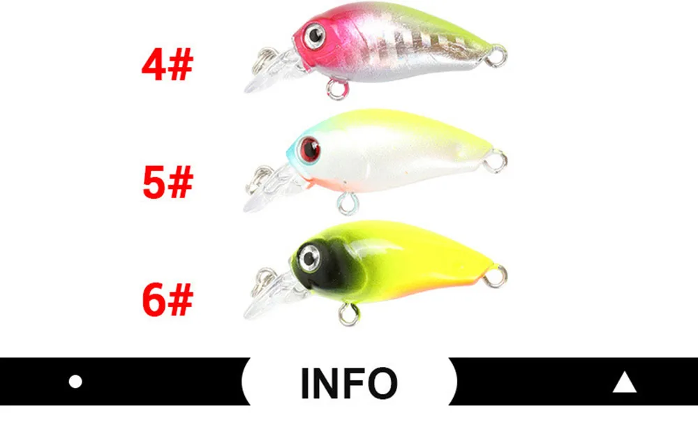 Color: 6 coloresLongitud: 4,5 cmPeso: 3,8gTamaño del anzuelo: acero rico en carbono n. ° 6, tres anzuelosProfundidad de inmersión: Sistema de superficie