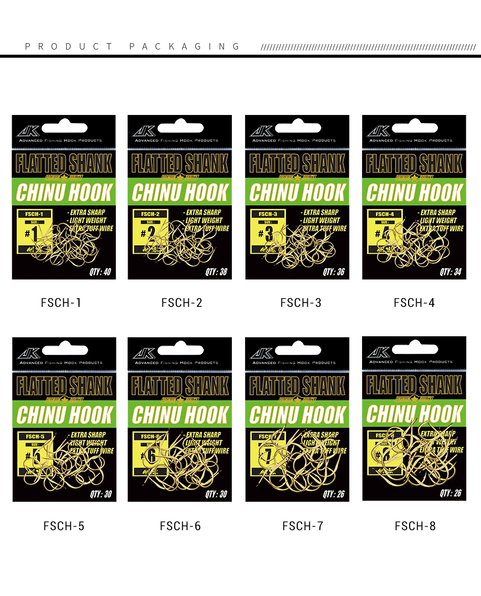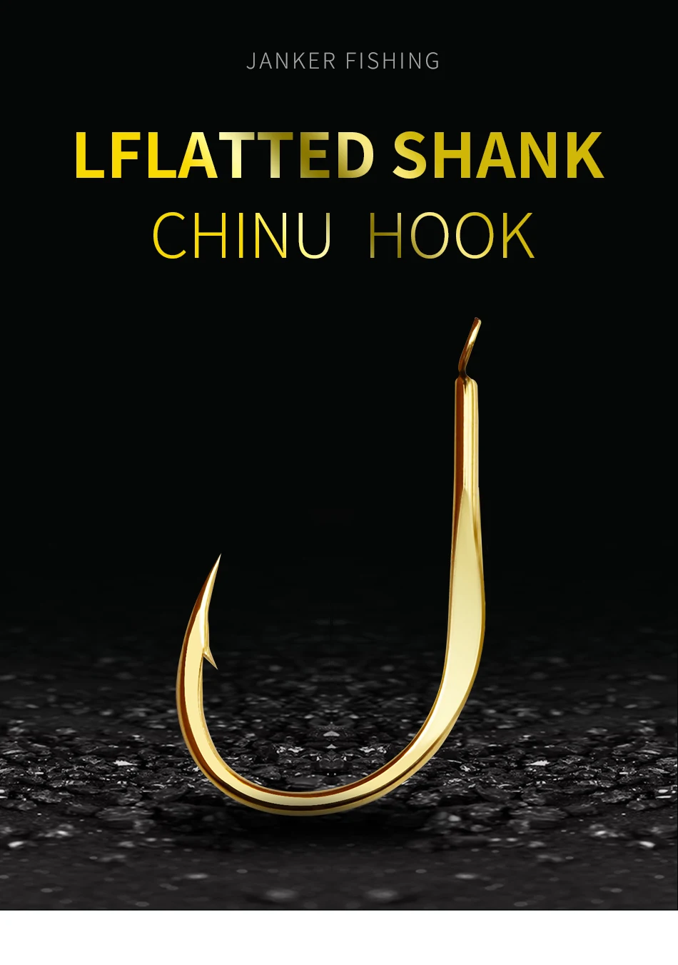 Los ganchos de Chinu de Janker (PSCHS) son de alambre de calibre medio/pesado con vástago corto, ojo vuelto, curva redonda forjada y punto curvo fuera de juego. El vástago del gancho plano mejora en gran medida la tensión.