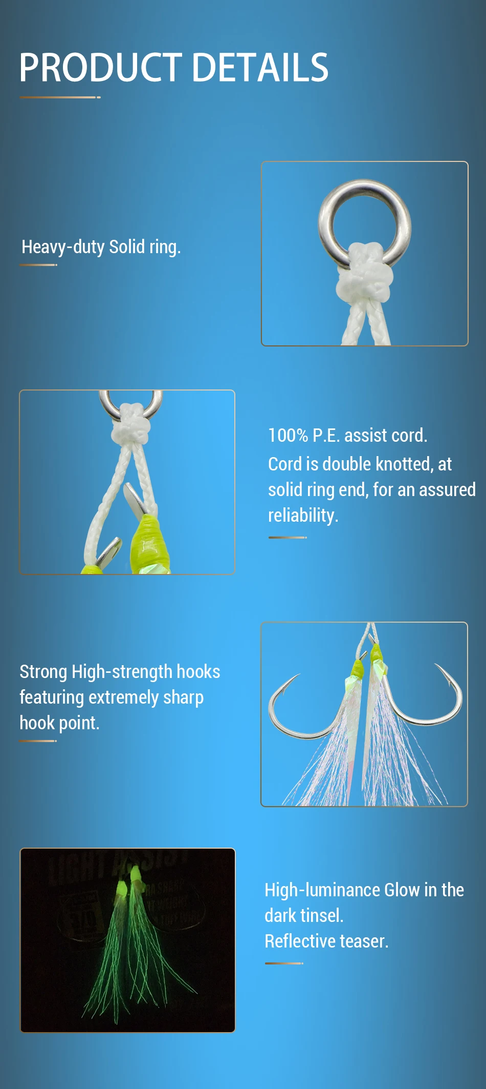 Vienen instalados con ganchos fuertes y afilados para un juego de ganchos seguro y con una combinación de materiales de la más alta calidad, brillan y son muy atractivos.