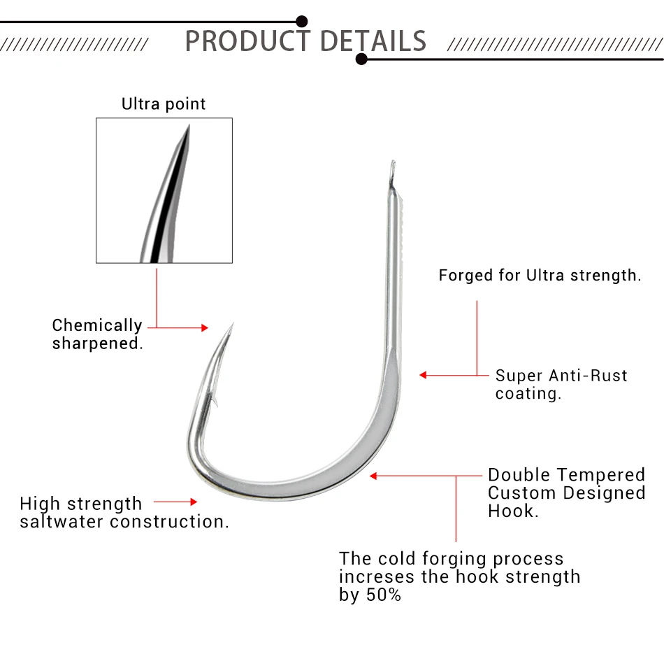 Construido con acero al carbono de alta calidad con punta químicamente afilada y recubierto con revestimiento listo para agua salada de alto desgaste para la mejor durabilidad. Son los ganchos de mejor calidad con una excelente calidad de construcción.
