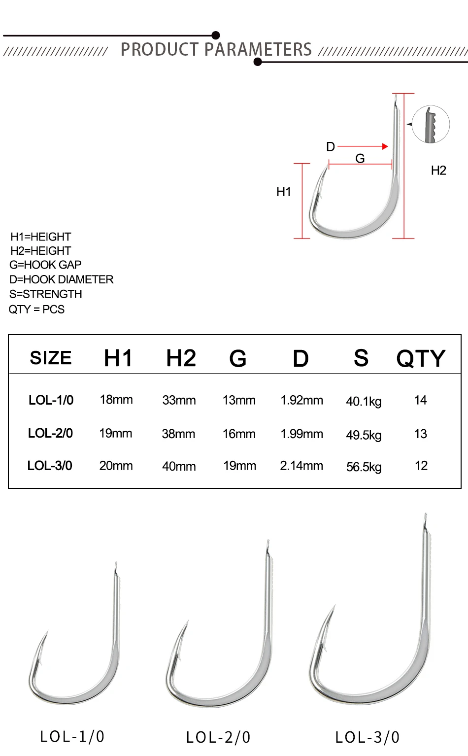 JK LOL Jigging Hook está construido fuerte con su área templada específica en el vástago. Están diseñados para ser increíblemente fuertes y el punto de gancho está en ángulo para la penetración de Punto más eficiente.