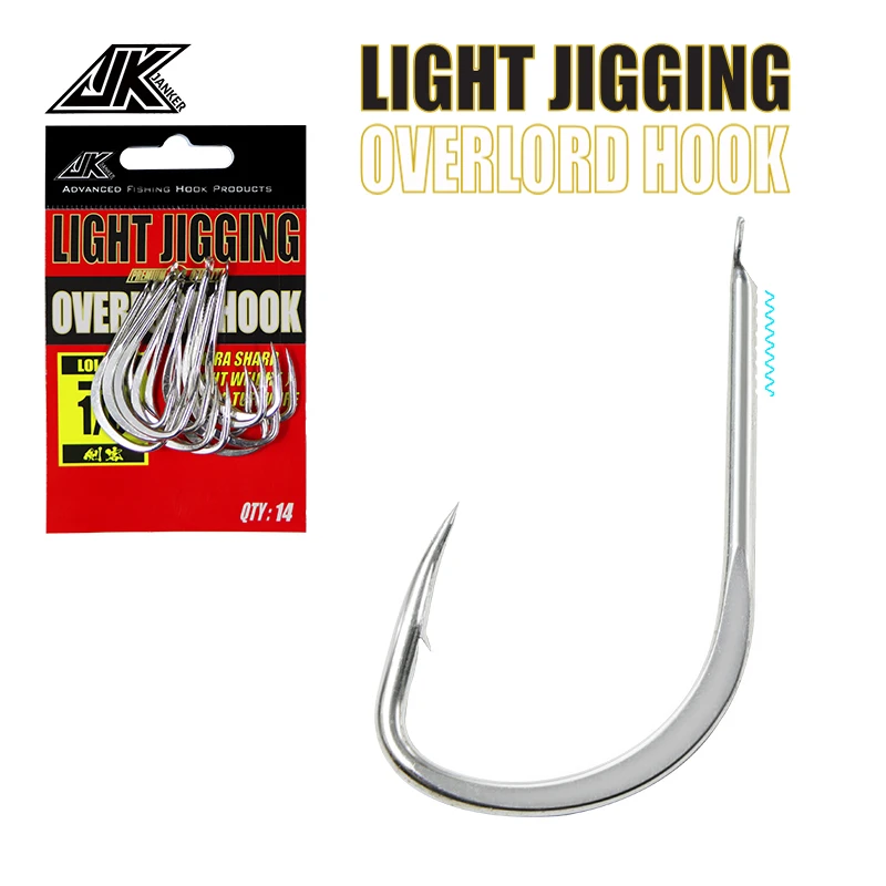 JK LOL Jigging Hook está construido fuerte con su área templada específica en el vástago. Están diseñados para ser increíblemente fuertes y el punto de gancho está en ángulo para la penetración de Punto más eficiente.