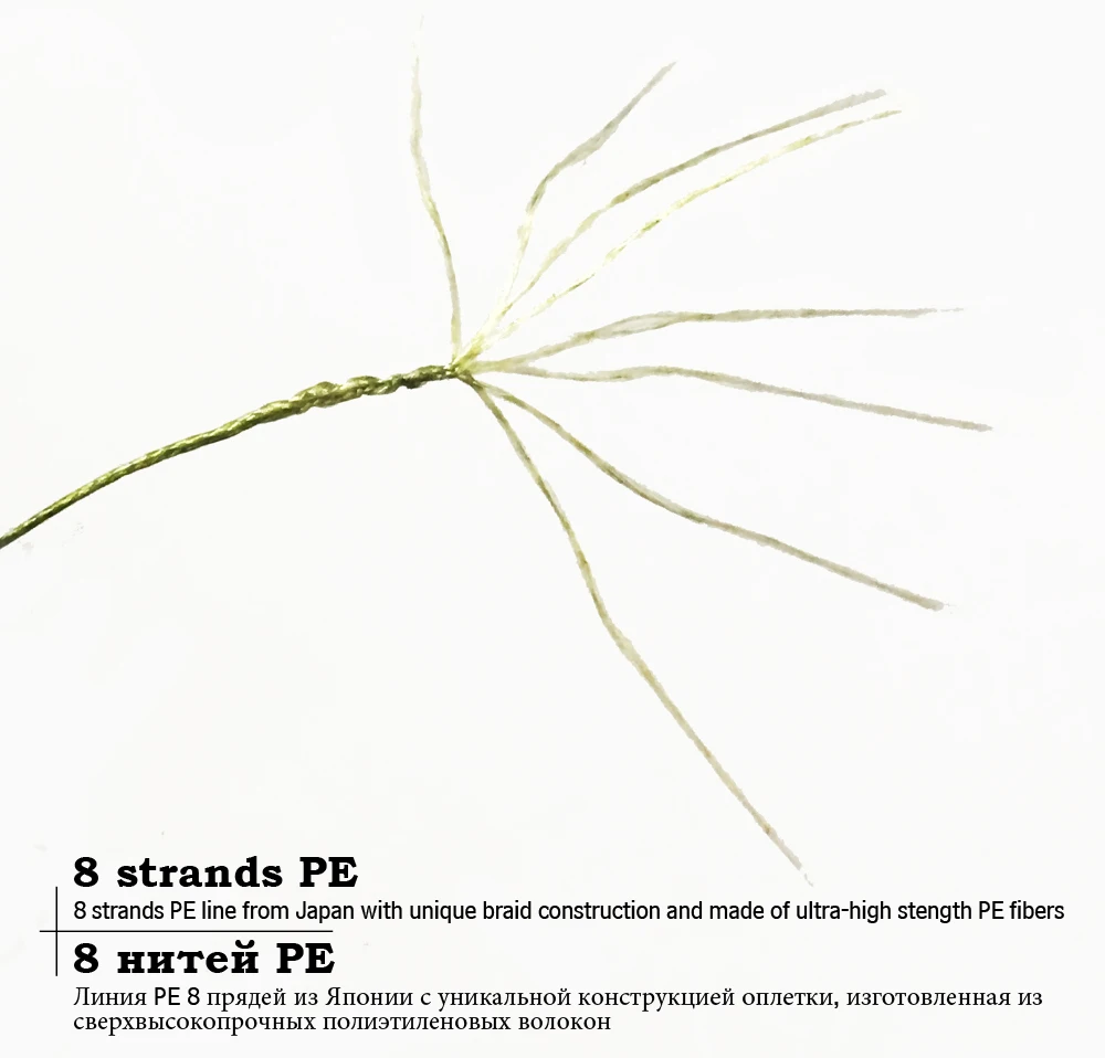 Línea de PE de 8 hebras de Japón con una construcción de trenza única y hecha de fibras de PE ultraaltas.