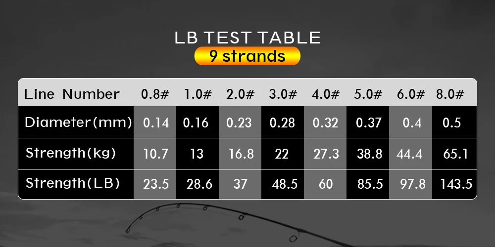 Prueba LB para 9 hilos: 28,6 37 48,5 60 85,5 97,8 143.5LB (opcional)