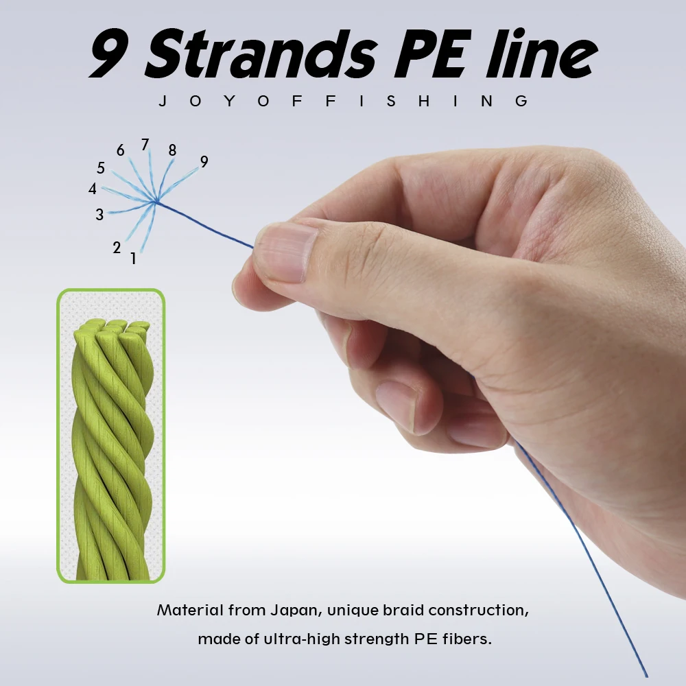 Línea de PE de 9 hebras, material de Japón, construcción trenzada única, hecha de fibras de PE de ultra alta resistencia