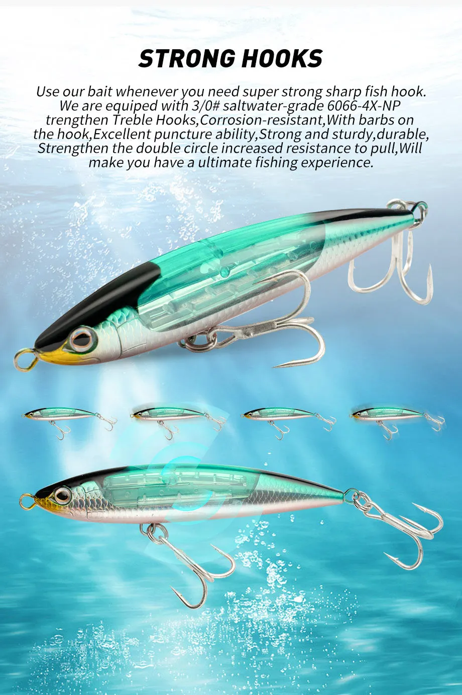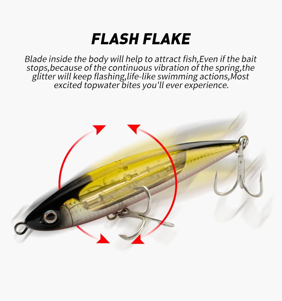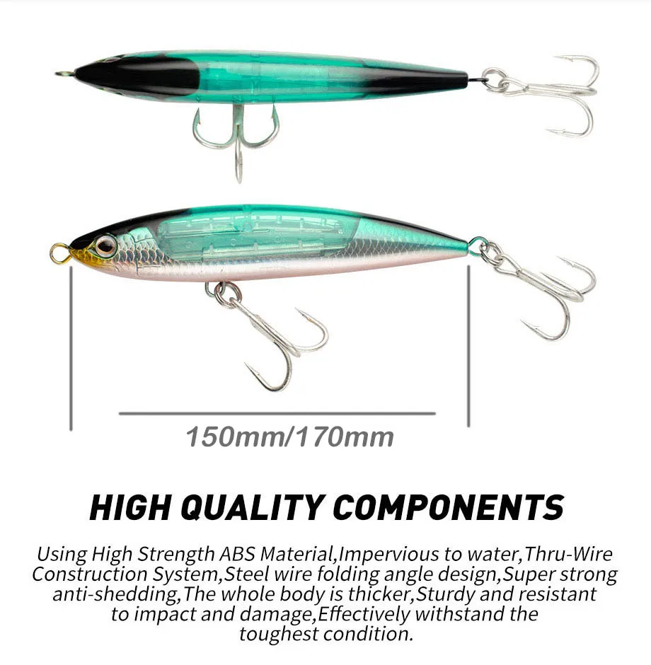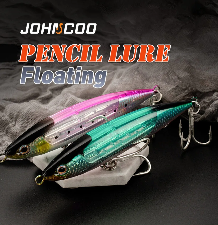 JOHNCOO, 15cm, 17cm, Topwater, lápiz, Señuelos de pesca para perros, cebo duro Artificial, hoja Flash, Señuelos flotantes de agua salada para curricán