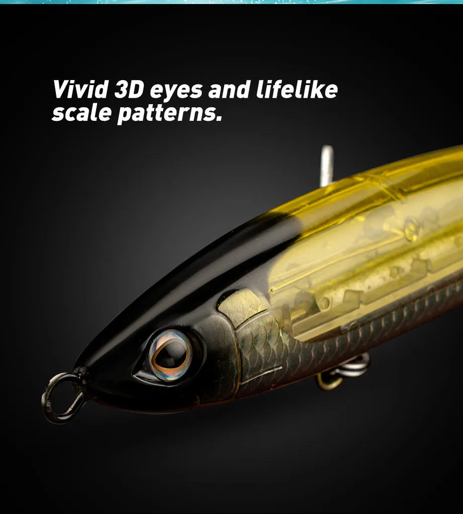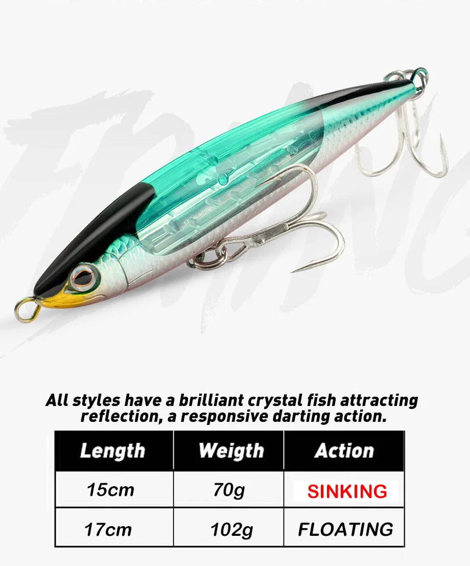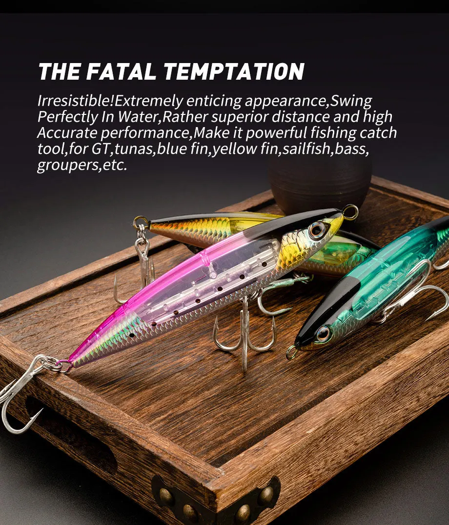 LA FATAL TEMPTACIÓN: ¡Irresistible! Aspecto extremadamente atractivo, papel holograma de primer nivel y pintura de PU, colores y patrones brillantes, ojos 3D realistas, diseños del cuerpo que tienen suficiente volumen, balancean perfectamente en el agua, distancia superior y rendimiento de alta precisión, lo convierten en una poderosa herramienta de captura de pesca. Para GT,tunas,aleta azul,aleta amarilla,peschuga,grupos,etc.