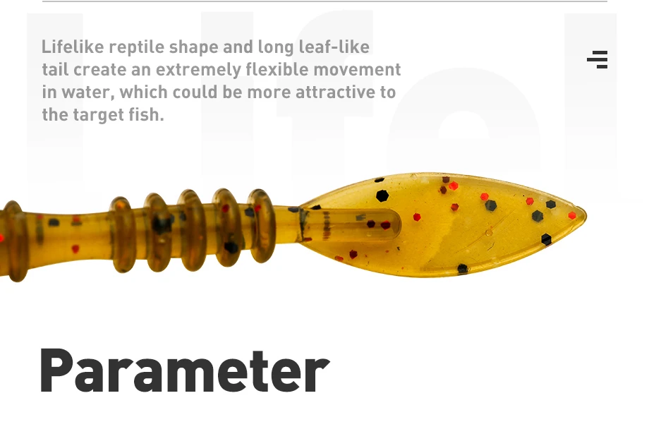 1. La forma de reptil realista y la cola de hojas largas crean un movimiento extremadamente flexible en el agua, que podría ser más atractivo para el pez objetivo.