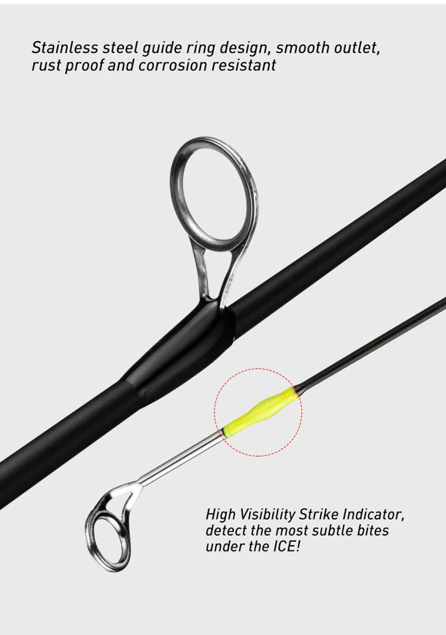 【Sensible y duradera】La caña de pescar en hielo está equipada con una guía de acero inoxidable con inserciones pulidas, resistente a la corrosión, al óxido y suave, ayuda a minimizar la fricción para mejorar la sensibilidad.