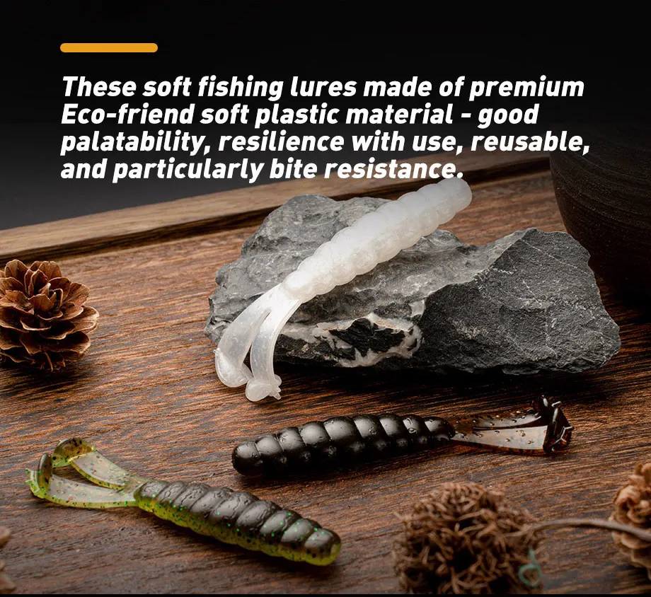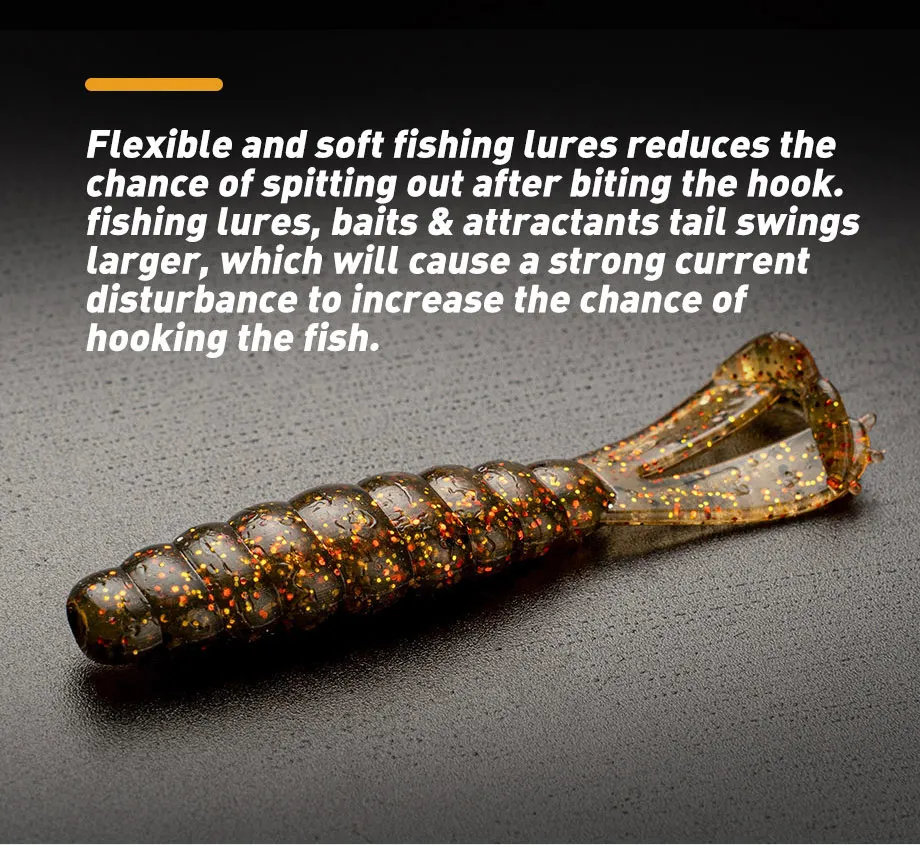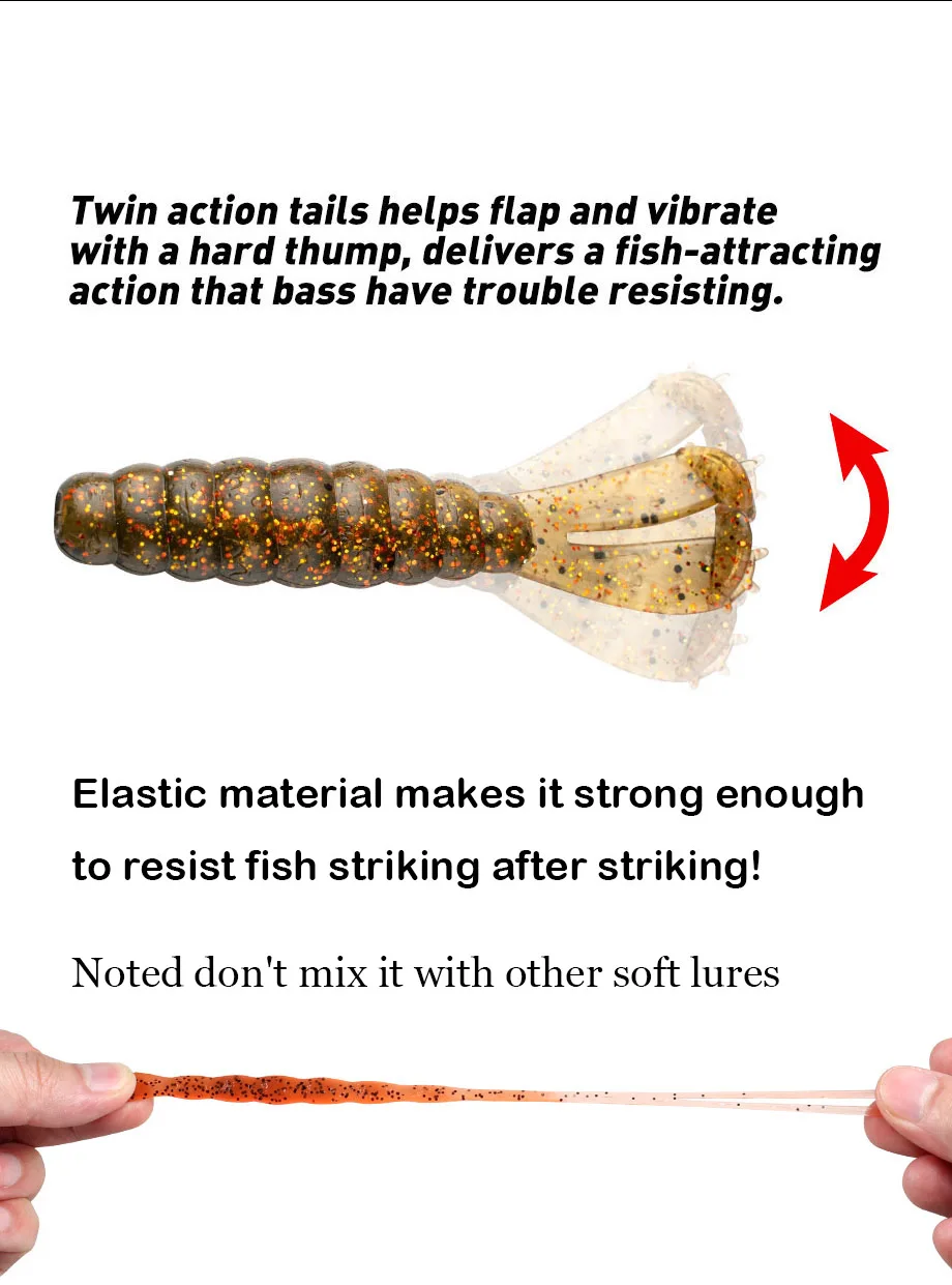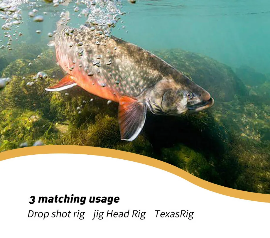 Dos colas en T: los swimbaits de plástico blando cuentan con dos colas en T de alta acción, ayudan a batir y vibrar con un golpe duro, brindan una acción que atrae a los peces que el lubina tiene problemas para resistir
