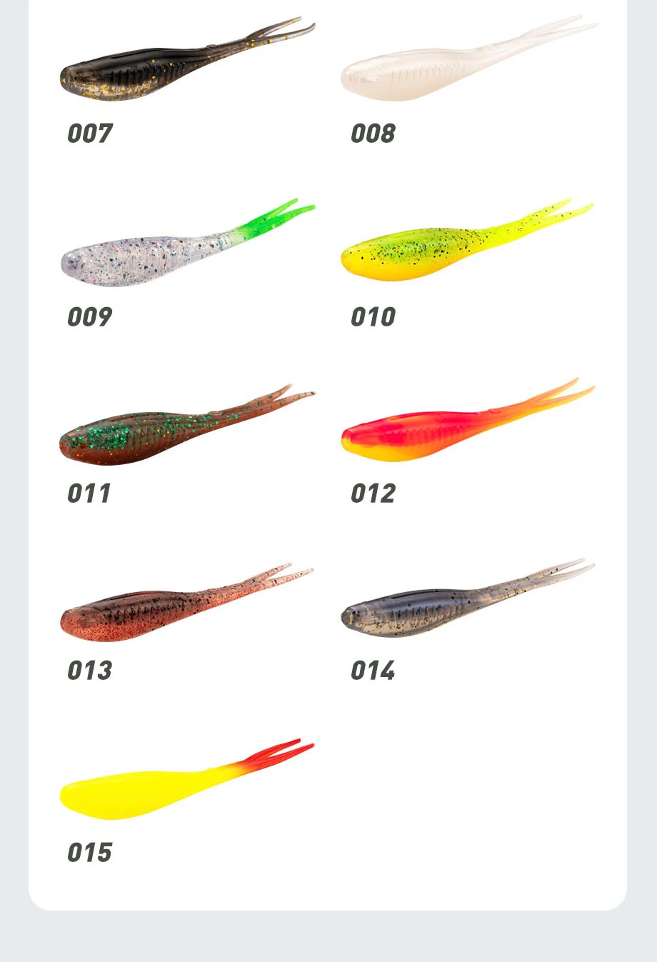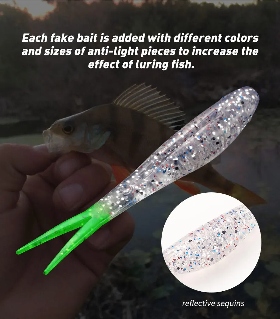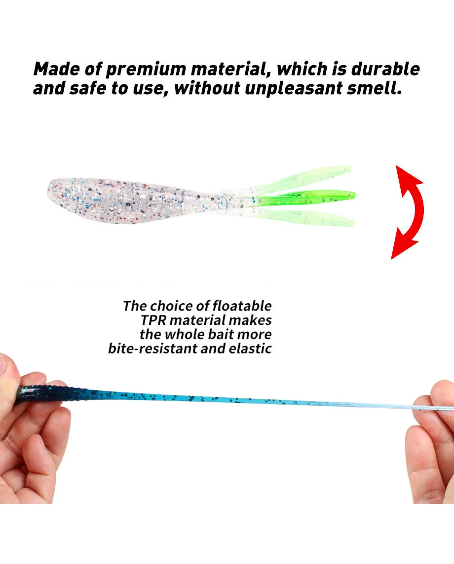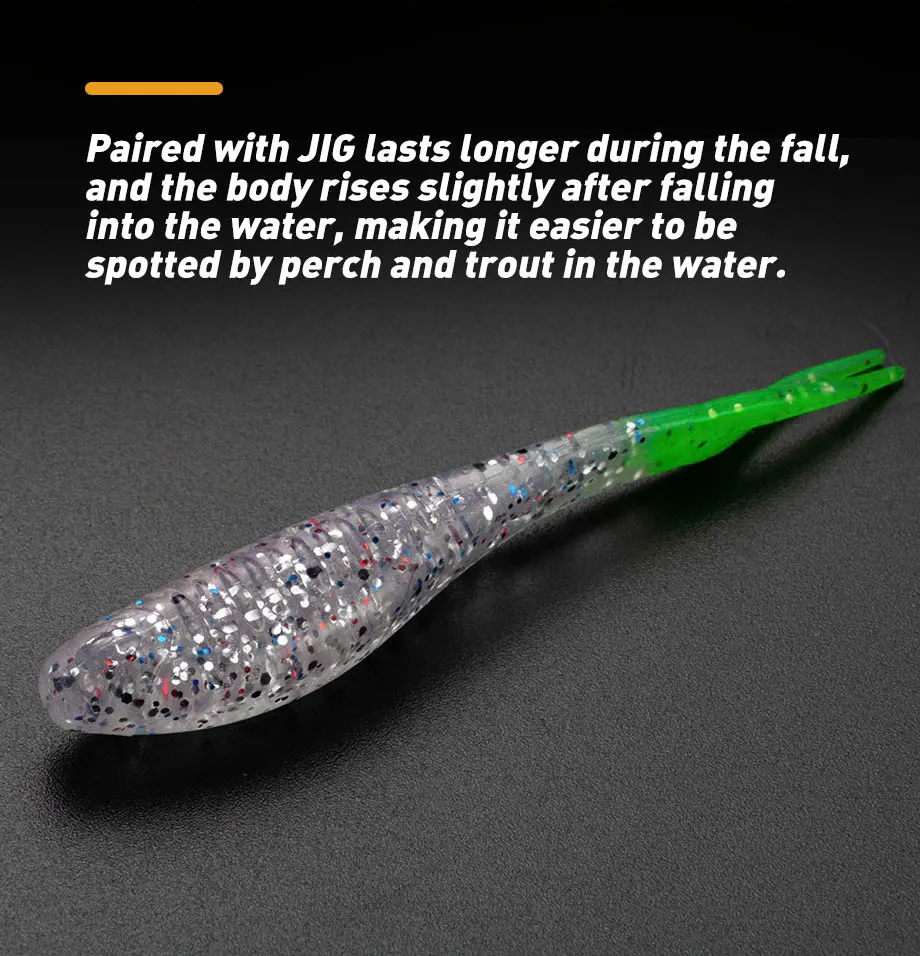 La elección del material TPR flotante hace que todo el cebo sea más resistente a mordidas y elástico. El señuelo suave flotante. Combinado con JIG dura más durante el otoño, y el cuerpo se levanta ligeramente después de caer al agua, lo que hace que sea más fácil ser visto por percas y truchas en el agua.